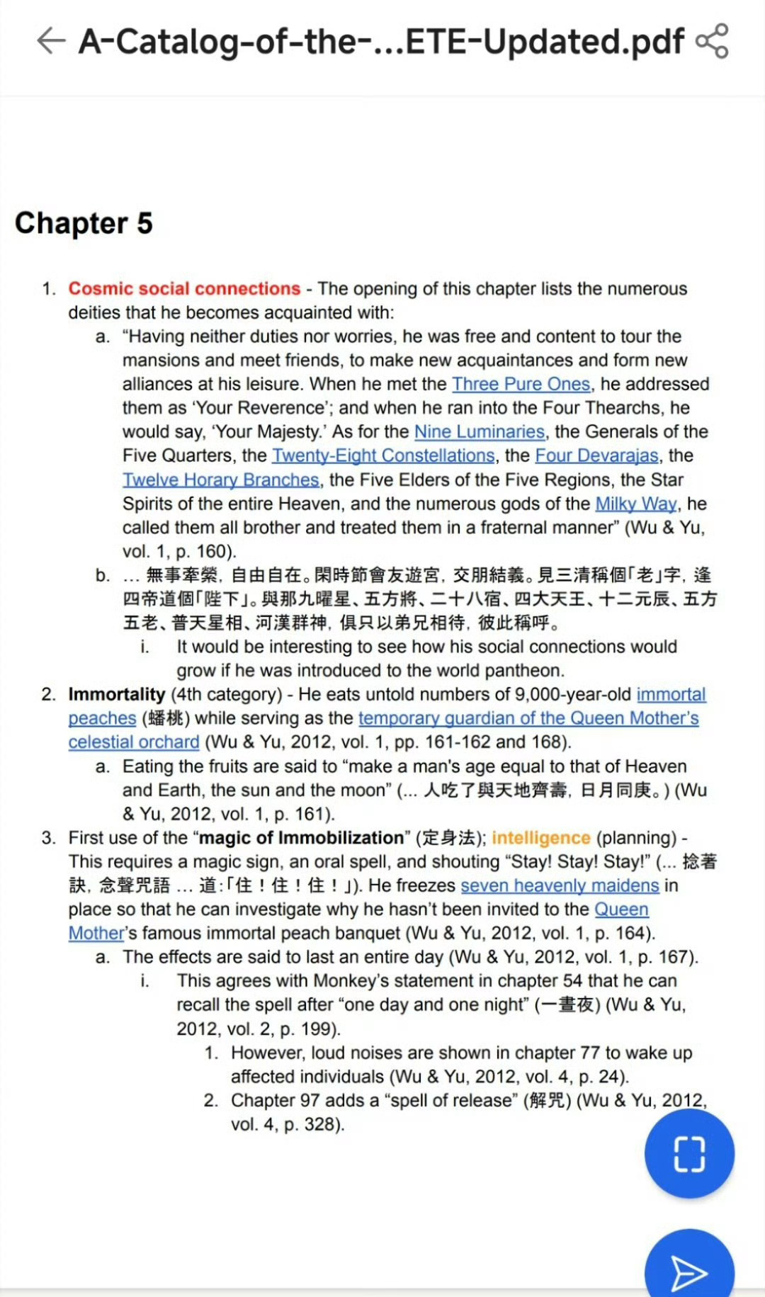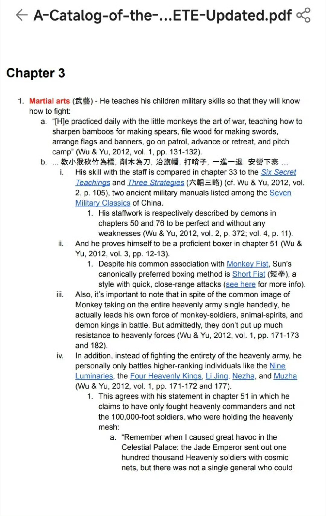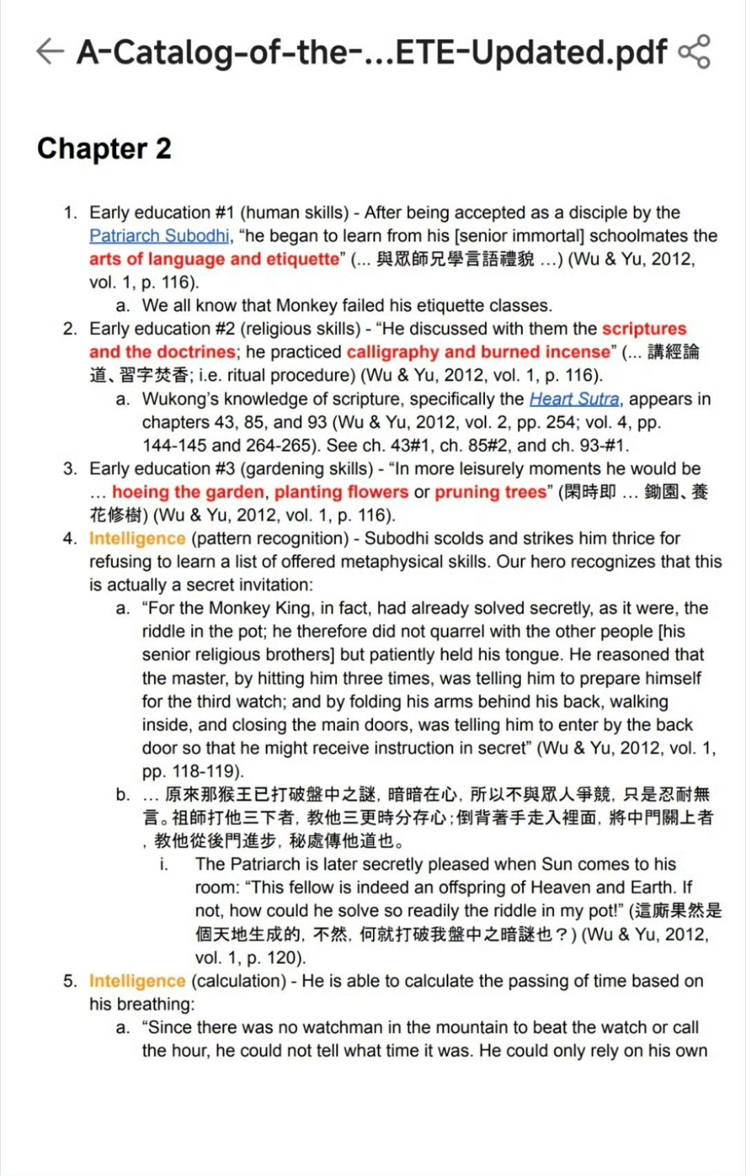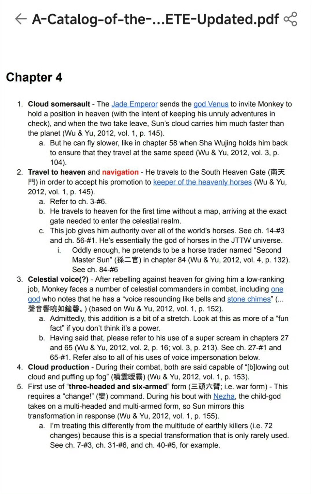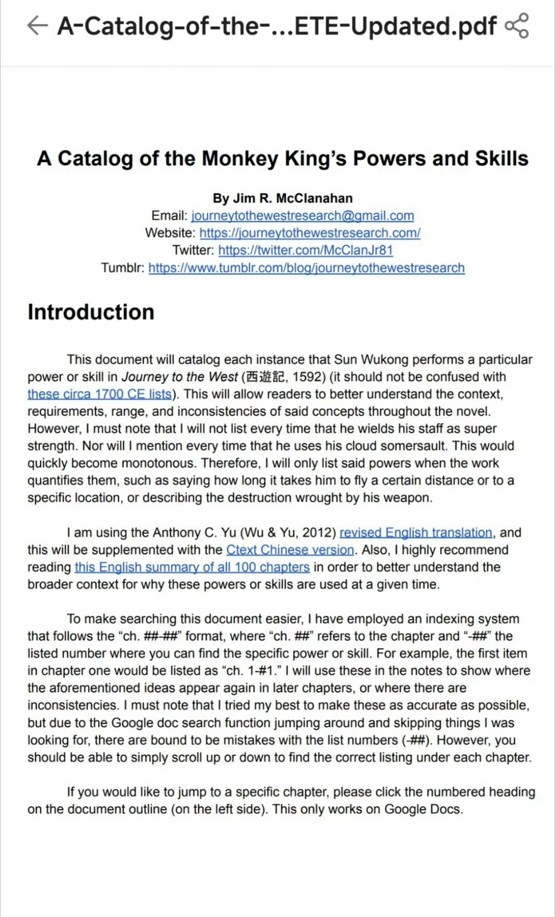 当有人说自己看了800遍西游记其实很多人都没有看过《西游记》原文。¹ 个人算读书很多的,但四大名著里《红楼梦》看过三四遍,《三国演义》两三遍,《水浒传》一遍,但《西游记》半遍也没看过。² 但有一个老外极度痴迷《西游记》。图1:光孙悟空的力量和技能就做了200多页的文档,还附录繁体中文原文!热点科普