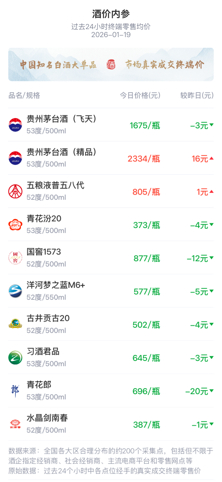 今日市场普跌,十大核心单品呈现八跌两涨格局,青花郎领跌环比下跌达20元;国窖1573紧随其后回调12元;洋河梦之蓝M6+环比下跌5元;古井贡古20、青花汾20各下跌4元;习酒君品、飞天茅台均下跌3元;水晶剑南春微跌1元。上涨产品方面仅精品茅台逆势大涨16元,五粮液普五八代温和上涨1元,头部酒企的新推核心高端产品显示出价格韧性,而行业去库存压力下价格分化势头持续。