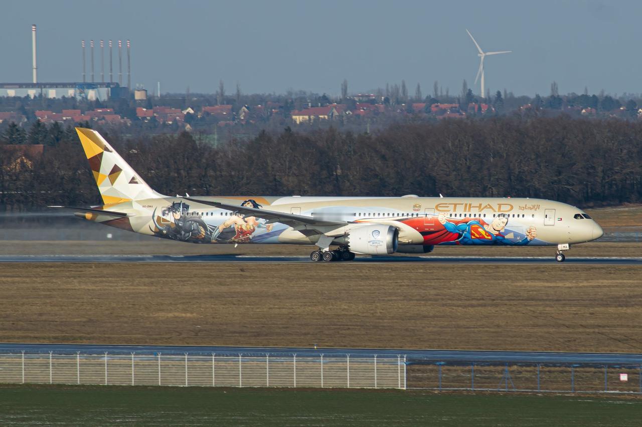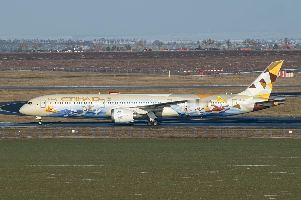 阿提哈德航空(Etihad Airways)一架身披“华纳兄弟”特别涂装的波音787-10客机,执飞从布拉格飞往阿布扎比的航班。你能认出涂装里的角色吗?