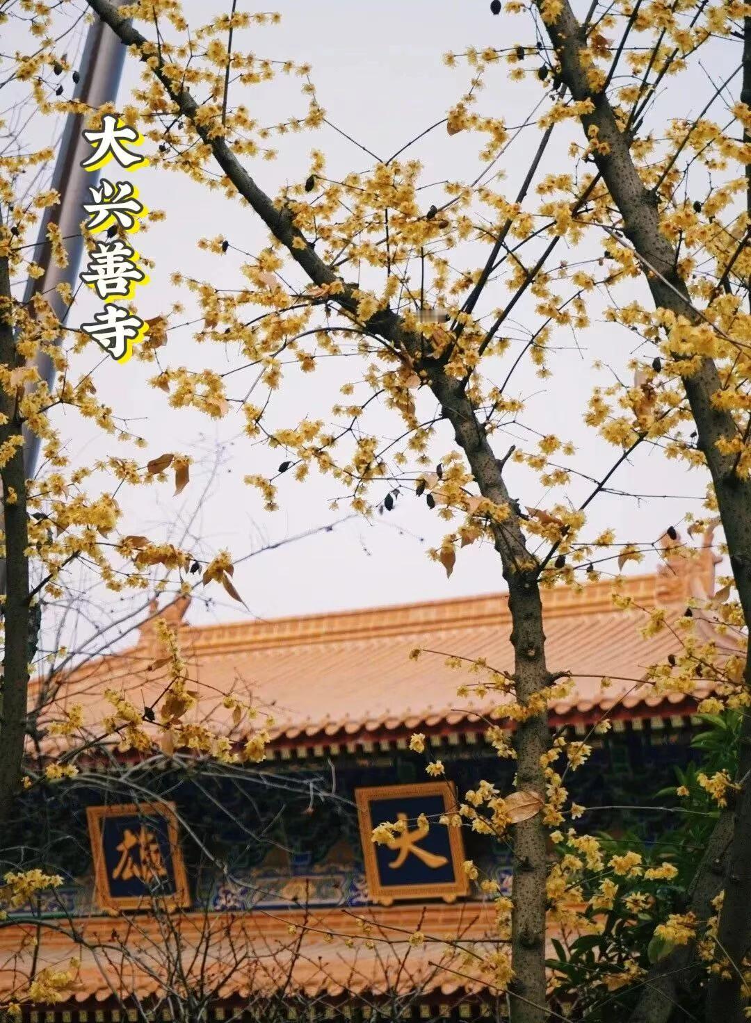 西安第一波腊梅花开,5大免费赏花地推荐! 赴一场腊梅之约,揽一身冬日清香🌼 西安的第一波腊梅花开啦!古都的冬天又浪漫了起来! 可赏花的地方很多,都不用远行,就在家门口的公园!全免费💃 👉大明宫 从“大明宫”地铁站下车,定位“左银台门”,进去右转不远,成片的腊梅林就撞入眼帘。 枝头腊梅尽数绽放,朵朵金黄簇拥成团,密密匝匝,找对角度,轻松拍出沉浸式徜徉腊梅林的氛围感大片👒 这边还有少量红梅正在悄然舒展花瓣、慢慢绽开,不用跑断腿,一站收获双梅同赏的惊喜🌺 👉兴庆宫公园 从南门进就能看到腊梅了!超多汉服小姐姐来这里拍照📷 南门正对的是大片的红梅林,虽然还没有全开,但是饱满程度大于大明宫的红梅,相信再过一阵这里会惊艳西安! 南门进往右侧走是腊梅,唐风亭子配黄花,与汉服适配感拉满。南门进往左侧有几棵娇憨可爱的宫粉梅树,好多人都在这里拍照。🌸 👉丰庆公园 比较适合家在附近的人就近赏花,腊梅不多但比较集中,不要从正门进,从“丰庆公园”地铁C1口旁边的小道进,不远就能找到。 也正因为比较集中,丰庆公园的腊梅是我拍的这几个赏花点里最香的!你甚至不需用眼睛去找,香味自会引领你🥰 👉杜公祠 这里有3株百年古腊梅树,距今已经有210年历史了。 作为百年古树,这里的腊梅比平时见到的要高大不少,甚至高过了连廊。在有阳光的时候,薄薄的花瓣透影而现,仿佛是一件小小的艺术品。 这里是诗圣杜甫的杜公祠,看完腊梅,不妨再到纪念馆看看,更能明白诗圣的心路历程,深刻了解他所写下诗歌的含义。🕵️♀️ 👉大兴善寺 没见过大兴善寺的腊梅花,就不算在西安过了冬天! 身处净地,这里的腊梅仿佛与其他地方的腊梅气质都不一样。在古刹绿瓦红窗的映衬下,腊梅显得越发古典沉静。 祈愿的香火缓缓地冒着白烟,偶尔掺些腊梅的清香,特有的气息在鼻腔中不时徘徊,闻之让人心平气和。🙇♀️ / 赏花的好地方已经都分享给你啦~挑个好天气,去赏花,去出片,让自己被包裹在腊梅的清香中,吸收大自然的力量吧