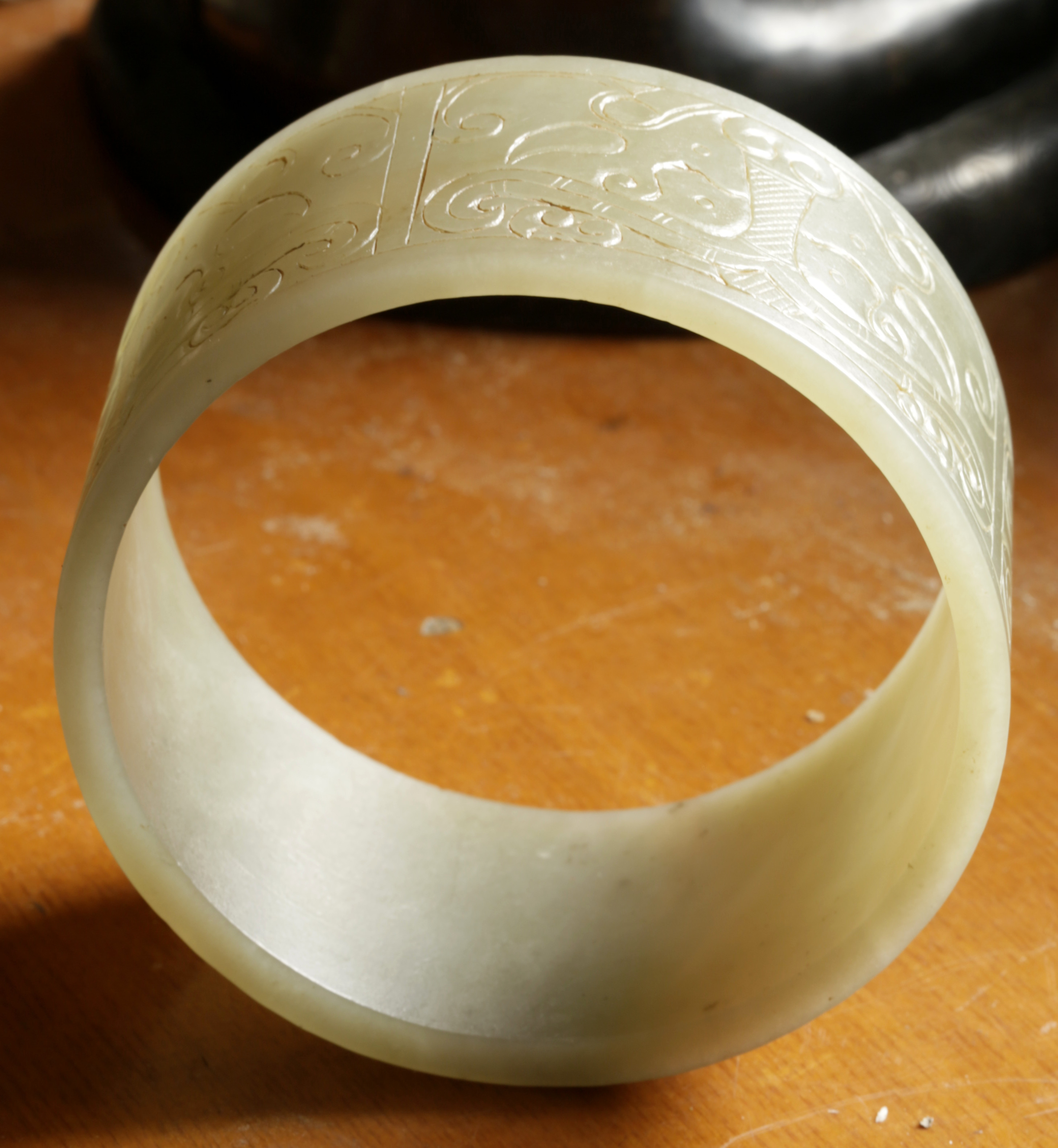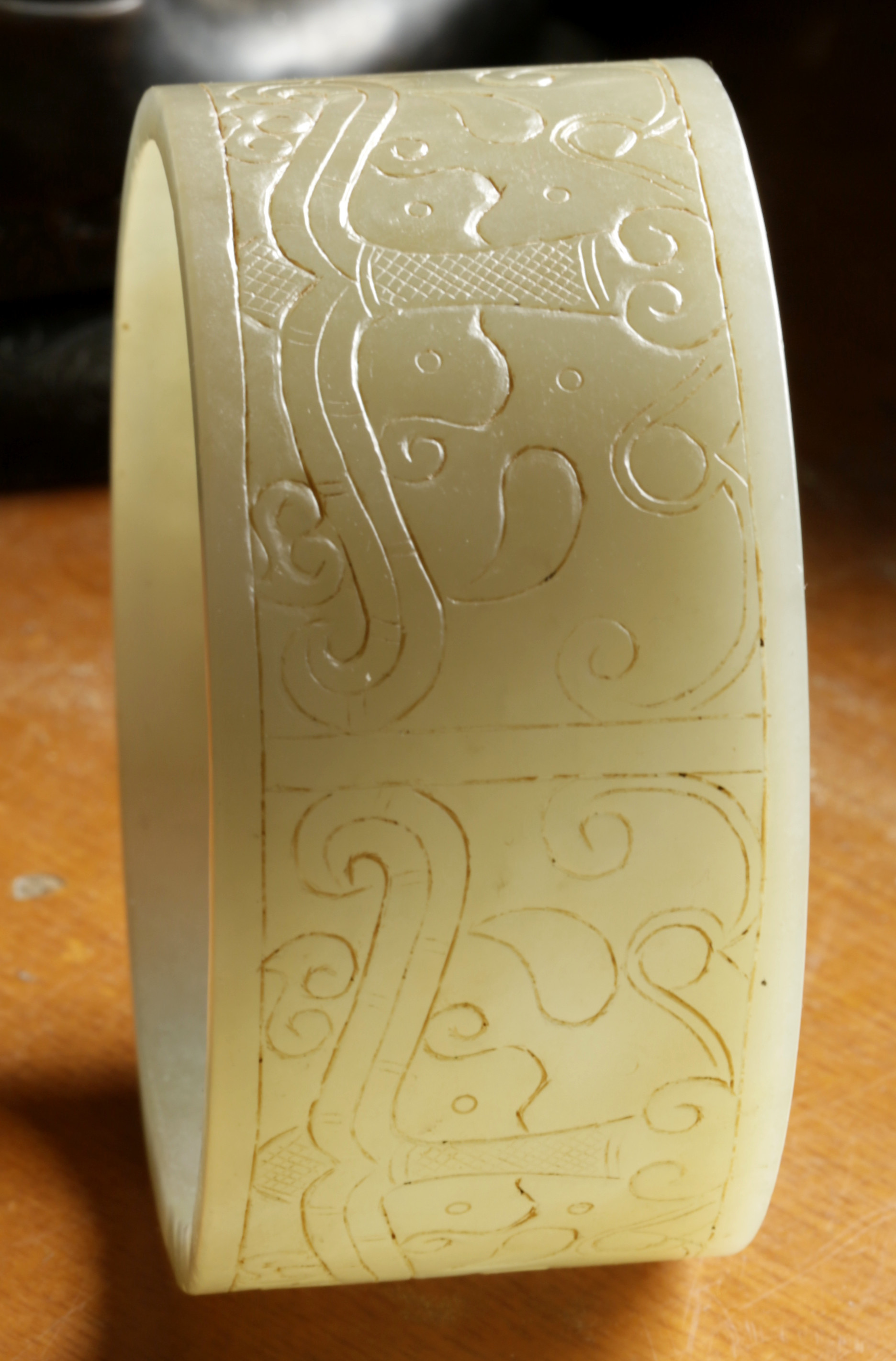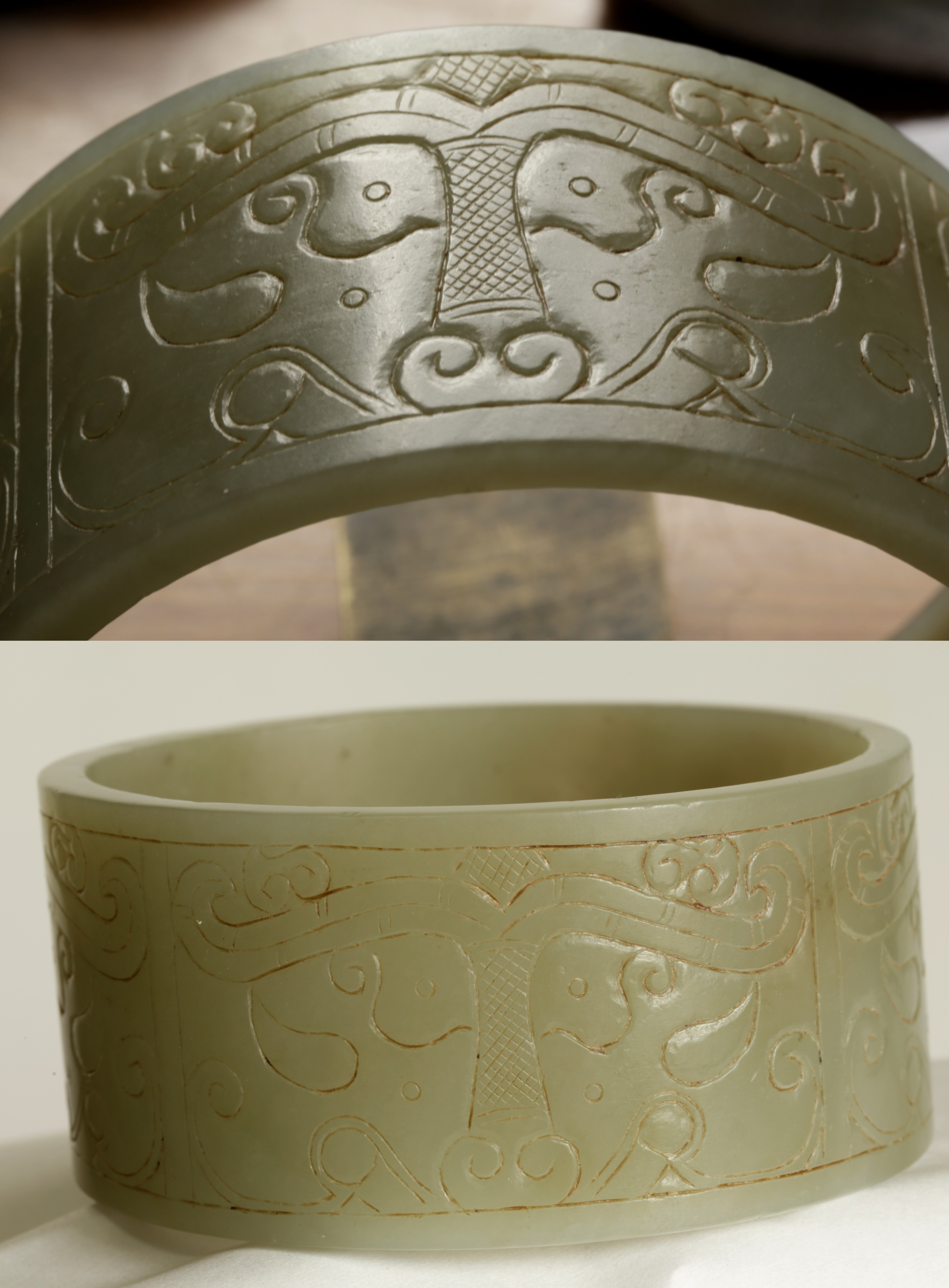 清 . 和田青白玉臂镯一件尺寸:重208克,外径98.8MM,内径88MM,边宽46.3MM,镯厚6.5MM。品相:全品。清代和田玉青白玉臂镯把玩件,臂是人体最容易被注意到的部位之一,无论是前臂或是后臂,尤其是在夏秋两季,臂的重要性和魅力有时候不亚于脸部。因此,在中国西汉以后,佩戴臂镯之风盛行,是妇女们十分重视的装饰品,既可增添女性的妩媚、高贵和典雅,更显独特的品位。此镯形制较扁宽,上浅浮雕汉代的兽面纹、花卉纹、勾云纹装饰,兽面纹流畅遒劲,刻划随形流线型阴线为饰,周边浅浮雕以花卉纹、勾云纹、几何纹,构图别致,工艺精巧,古韵盎然。臂镯,是女性带在手臂上的镯子,唐宋元明清的古画仕女手臂上,还有神仙天女壁画上女性都带有臂镯,目前臂镯都是用于把玩收藏,臂镯是可以带在女性手臂上的,不掉的,非常大,此是老的臂镯,应该是明清件古玉臂镯,雕工精美,品相完整。保真和田玉,可出和田玉证书。