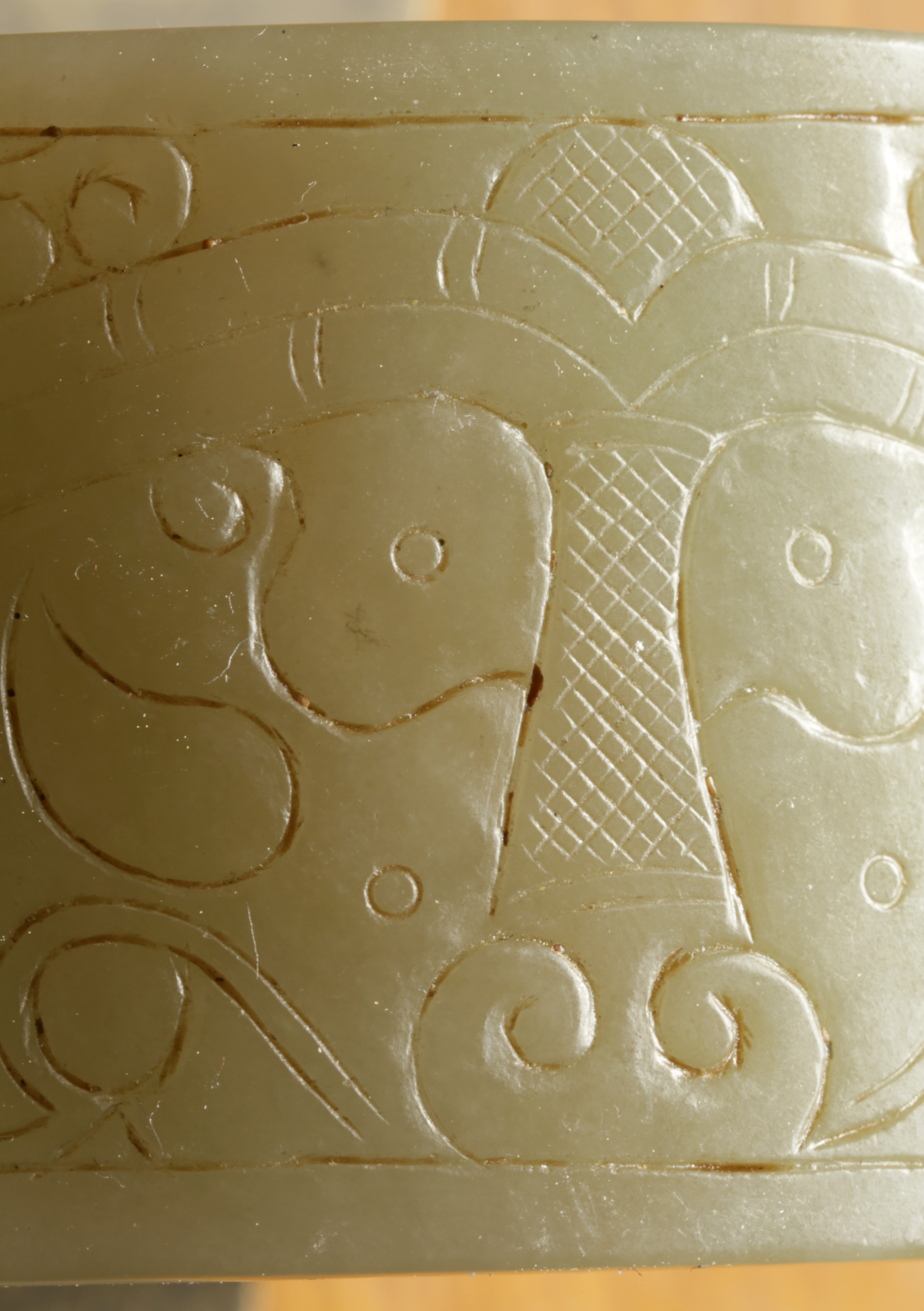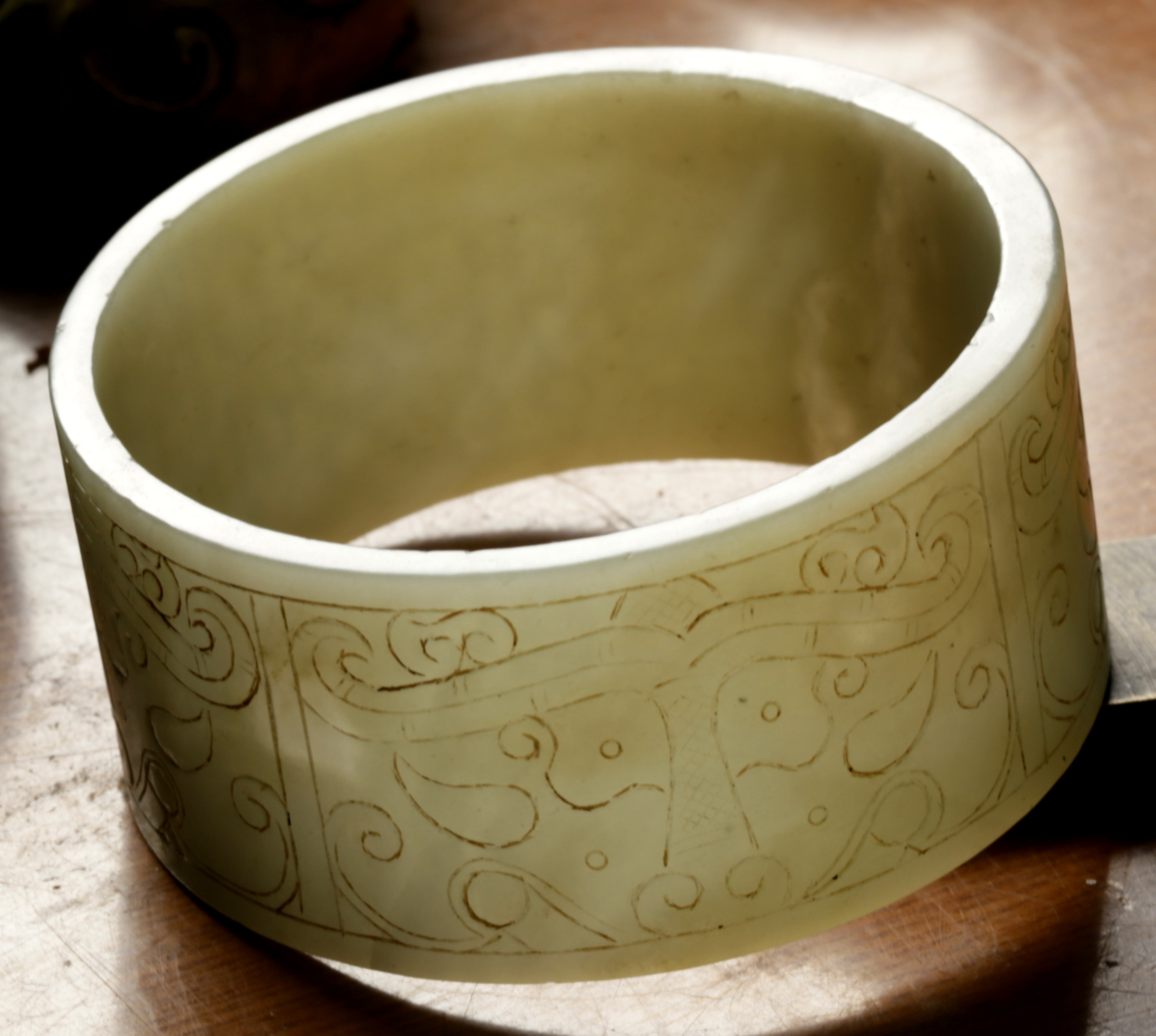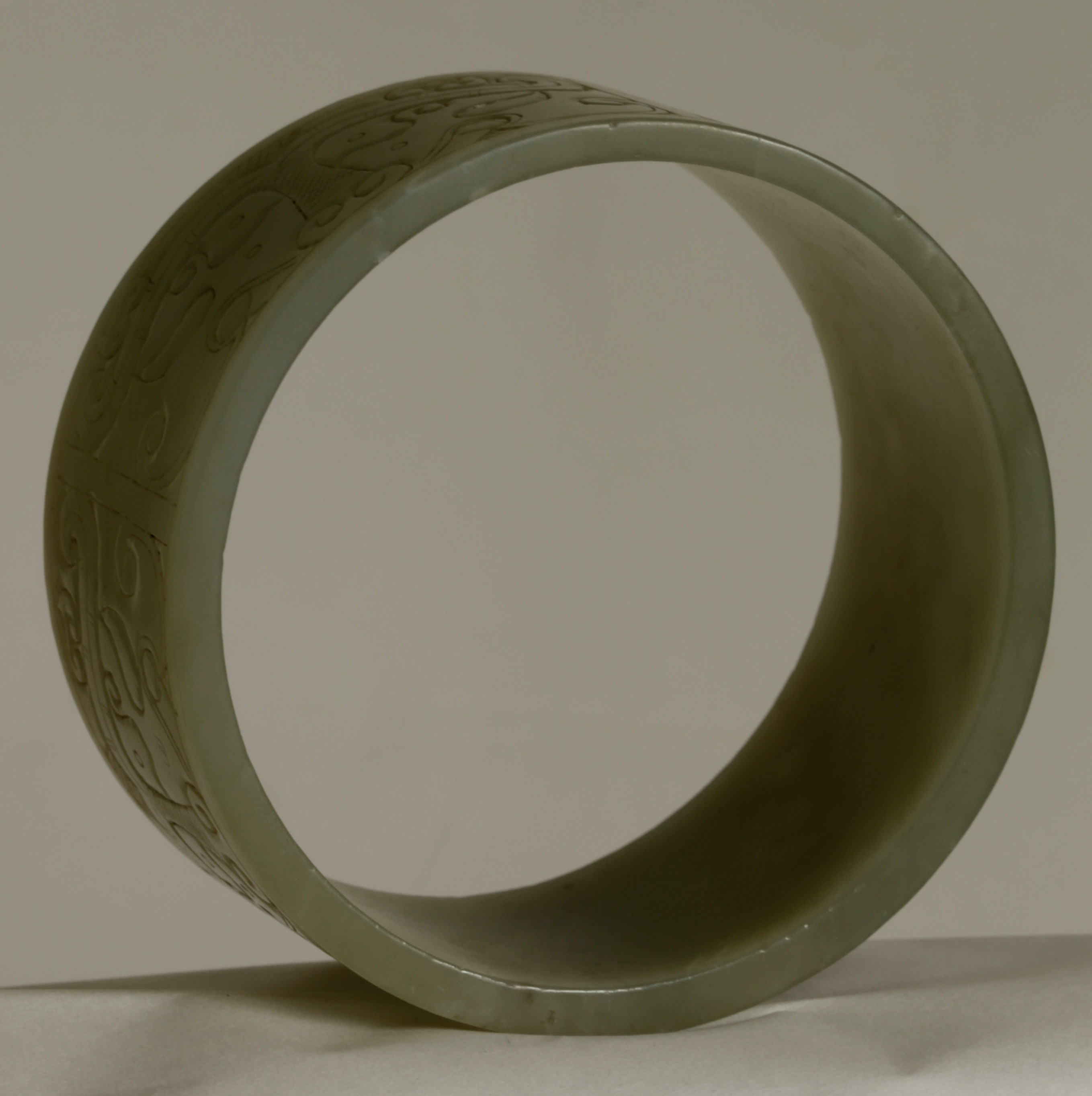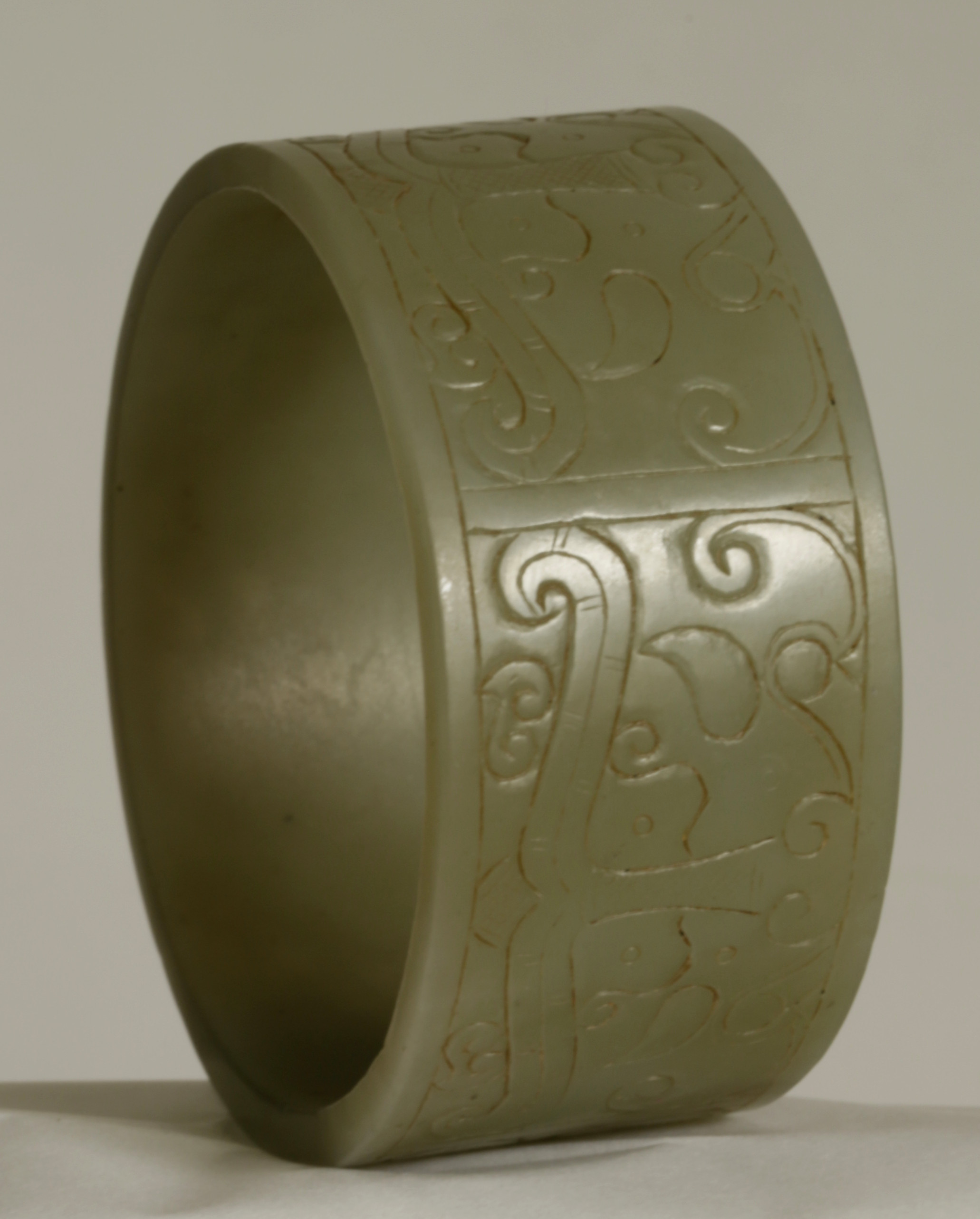 清 . 和田青白玉臂镯一件尺寸:重208克,外径98.8MM,内径88MM,边宽46.3MM,镯厚6.5MM。品相:全品。清代和田玉青白玉臂镯把玩件,臂是人体最容易被注意到的部位之一,无论是前臂或是后臂,尤其是在夏秋两季,臂的重要性和魅力有时候不亚于脸部。因此,在中国西汉以后,佩戴臂镯之风盛行,是妇女们十分重视的装饰品,既可增添女性的妩媚、高贵和典雅,更显独特的品位。此镯形制较扁宽,上浅浮雕汉代的兽面纹、花卉纹、勾云纹装饰,兽面纹流畅遒劲,刻划随形流线型阴线为饰,周边浅浮雕以花卉纹、勾云纹、几何纹,构图别致,工艺精巧,古韵盎然。臂镯,是女性带在手臂上的镯子,唐宋元明清的古画仕女手臂上,还有神仙天女壁画上女性都带有臂镯,目前臂镯都是用于把玩收藏,臂镯是可以带在女性手臂上的,不掉的,非常大,此是老的臂镯,应该是明清件古玉臂镯,雕工精美,品相完整。保真和田玉,可出和田玉证书。