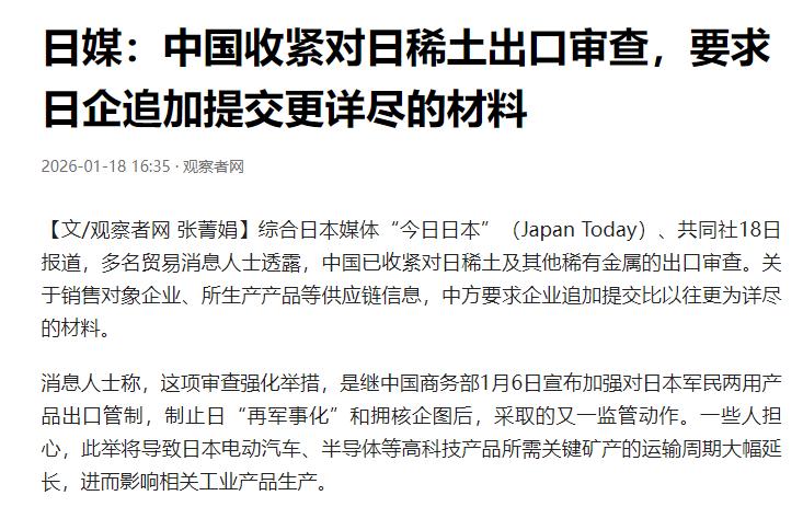 日本又吃了一闷棍,据共同社披露:中国已明确提出,要求日本企业在进口中国稀土时,提供更多的补充材料,而且“非常严格”。 报道称,自从中国加强对日本军民两用物项的出口限制后,日本在进口中国稀土方面已经日趋困难,即使是民事用途,也需要面临漫长的审查流程。 根据日本贸易界人士1月17日透露,日本企业在面对中方的出口审查流程时,除了需要准备此前要求的文件外,还被告知需要追加以下三个文件及说明: 第一,稀土最终将应用于何种终端产品; 第二,终端采购企业及所有中间经销商的详细信息; 第三,日本利用该批稀土生产的产品是否会出口至美国第三国。 中方这波操作绝非临时起意,导火索是去年11月初日本首相高市早苗的涉台不当言论,严重触碰中方红线后,中方反制措施就逐步落地。1月6日商务部已经明确加强对日本军民两用物项出口管制,如今稀土审查升级,就是这一系列反制的延伸动作。 日本企业的进口困境早就显现,此前即便只是民事用途的稀土进口,审查流程也已经大幅拉长。不少日本厂商反映,审批周期比以往延长数倍,部分订单甚至因此被迫延迟交付。现在又要追加三类详尽材料,无疑会让进口难度再上一个台阶。 这些材料要求精准击中了日本的软肋,中方要知道终端产品用途,是为了区分民用与潜在军工场景。要中间商和采购企业详细信息,是为了杜绝通过多层转售规避监管的漏洞。要确认是否出口第三国,更是直接堵死日本借道第三方把稀土制品转给美国的可能。 日本对中国稀土的依赖根本绕不开,2024年数据显示,日本稀土进口总量中71.9%来自中国。更关键的是,用于新能源车驱动电机、工业机器人伺服电机的镝、铽等重稀土,日本依赖度近乎100%。全球范围内,只有中国拥有完整的稀土冶炼分离和精深加工产业链,这是日本短期内无法替代的。 这种依赖直接决定了日本产业的脆弱性,野村综合研究所测算过,若中国稀土管制持续一年,日本GDP将损失2.6万亿日元,跌幅达0.43%。汽车、电子零部件、风力发电等五大核心行业都会受重创。有日本车企坦言,现有稀土库存仅能支撑3到6个月,超过半年整个行业都会承压。 为了破局,日本已经开始急病乱投医。1月12日,日本深海钻探船“地球号”从静冈市清水港出发,前往南鸟岛海域开展海底稀土泥浆钻探试验。项目负责人称若成功,2027年2月有望启动商业采矿。但这个方案可行性极低,稀土产业的核心门槛在冶炼分离,而非开采,日本短期内根本无法搭建完整产业链。 中方也早有预案堵死日本的规避路径,新规明确,任何国家若将原产中国的两用物项转移给日本,都会被依法追责。这让原本可能成为中间商的韩国企业压力巨大,毕竟韩国锑进口41%来自中国,没人愿意为了日本牺牲对华合作。 外交部发言人毛宁已经明确表态,中方举措是为了维护国家安全和利益,履行防扩散国际义务,完全正当合理合法。中方从未放弃维护全球关键矿产供应链稳定,只是这种稳定必须建立在相互尊重的基础上。 日本如今的困境完全是自食其果,明明知道稀土供应链依赖中国,却偏偏在台湾问题上发表不当言论,挑战中方底线。中方的管控措施,本质上是对日本错误行为的精准回应。若日本不及时纠正态度,后续稀土进口的阻碍只会更多,相关产业的损失还将持续扩大。