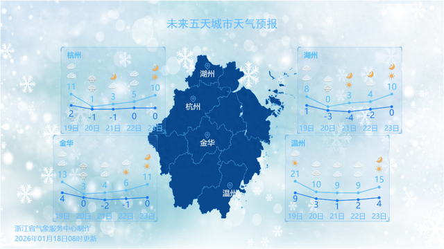 今天(19日)上午寒潮前锋率先抵达,浙中北地区中午起就有小雨飘落。伴随气温一步步下降,夜里浙西北山区的降雨就会转换成雨夹雪或雪的状态了。