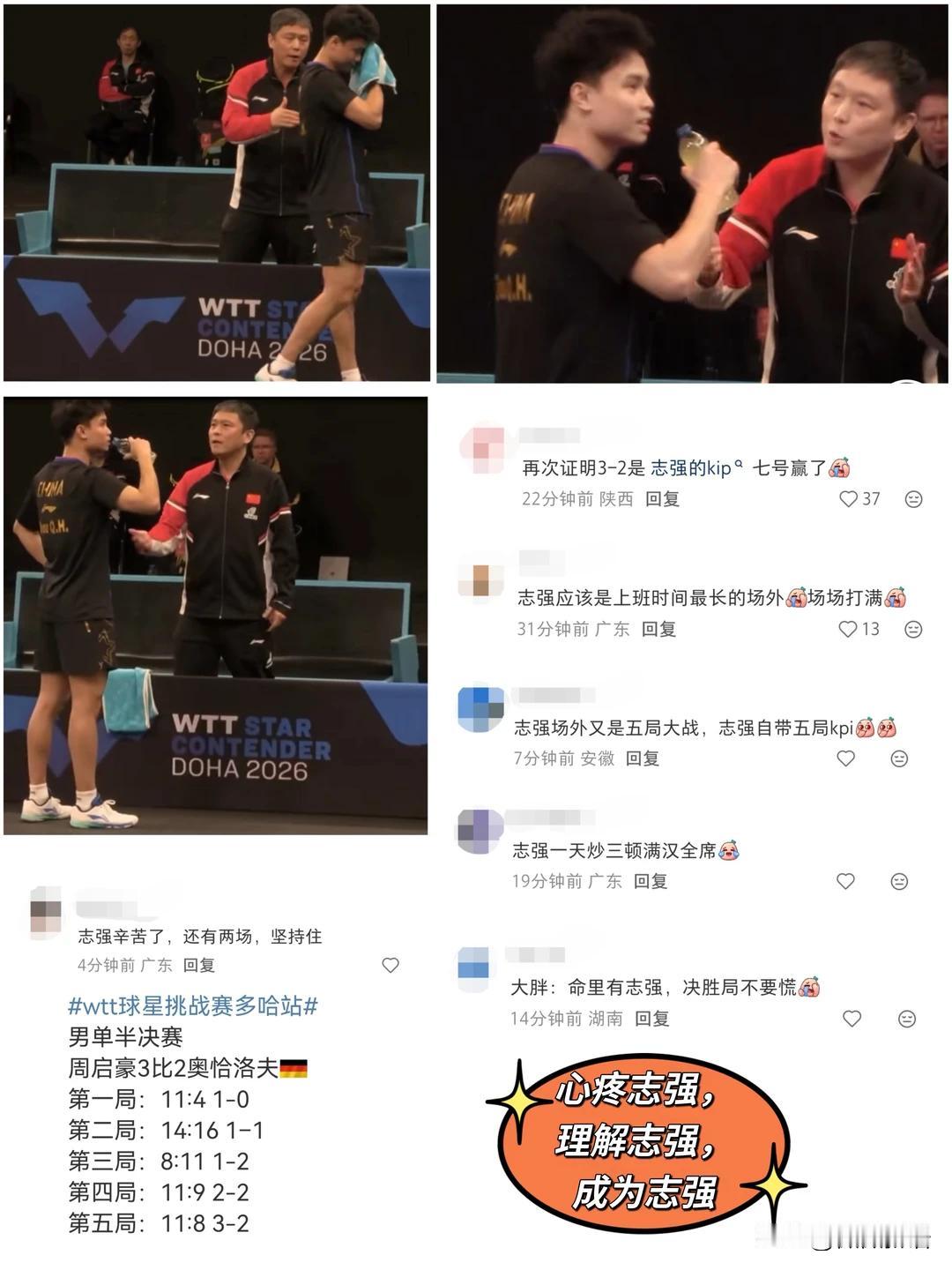 这次多哈球星挑战赛,志强成了最大赢家,周启豪拿了男单冠军,温瑞博拿了男单亚军,他俩都是志强家的,虽然志强在一开始很苦,但是苦尽甘来,徒弟们很争气。 这次多哈球星挑战赛,周启豪的第一场比赛就是打满五局的,当时周启豪是3-2赢了塔卡,赛后志强和周启豪在那复盘,志强边喝可乐边在那说,坐在志强对面的周启豪就在那听着,志强不容易啊。到了第二轮比赛,周启豪是对上了梁靖崑,周启豪是3-2赢了梁靖崑,晋级16强,到了第三轮比赛,因为教练不够,梁靖崑临时给周启豪做场外,周启豪是3-1赢了篠塚大登,晋级8强。在男单1/4决赛时,周启豪是3-1赢了队友黄友政,男单半决赛时志强是场外,周启豪又打满局了,也是3-2赢了奥恰。所以看了多哈球挑的比赛,大家说以前梁靖崑爱打决胜局,原因不在梁靖崑,原来是因为志强,因为这次只要志强做场外,男单把把决胜局。 虽然过程有些难熬,但是结果是好的,最终温瑞博和周启豪会师决赛,昨晚志强终于可以安心的在看台看比赛。这是周启豪首次拿到WTT球挑的冠军,他也肯定了自己,说在训练当中也是在技战术上面有一些微调跟调整,觉得效果还是很明显的。温瑞博这一站打的也很好,小将未来可期哦,继续加油!