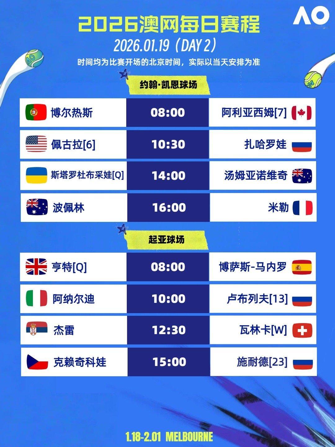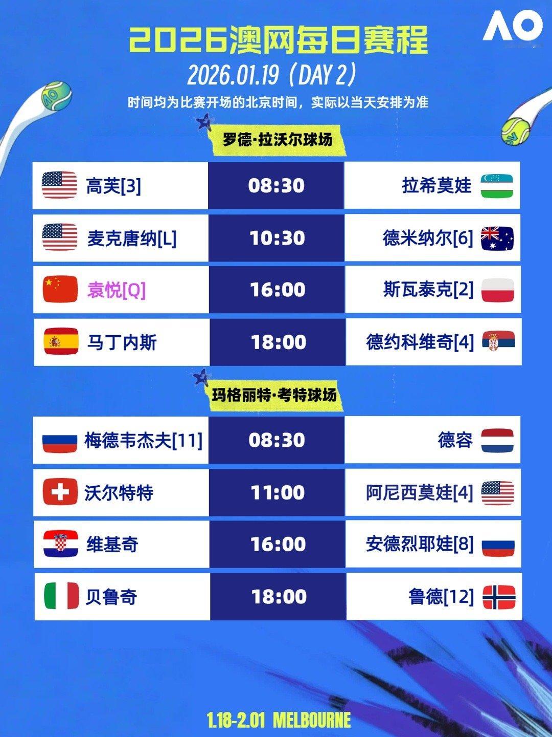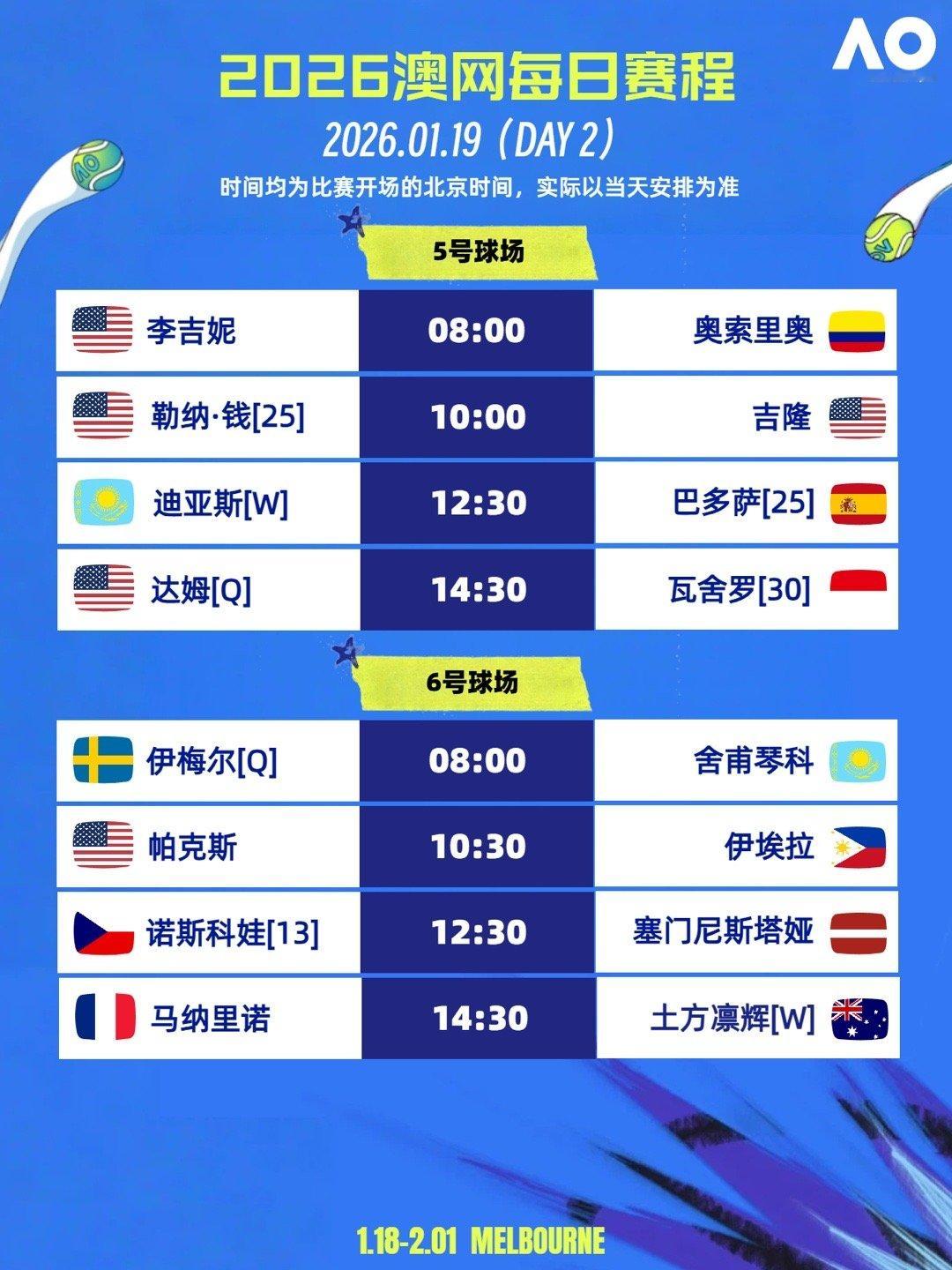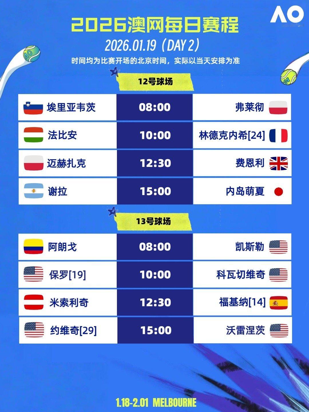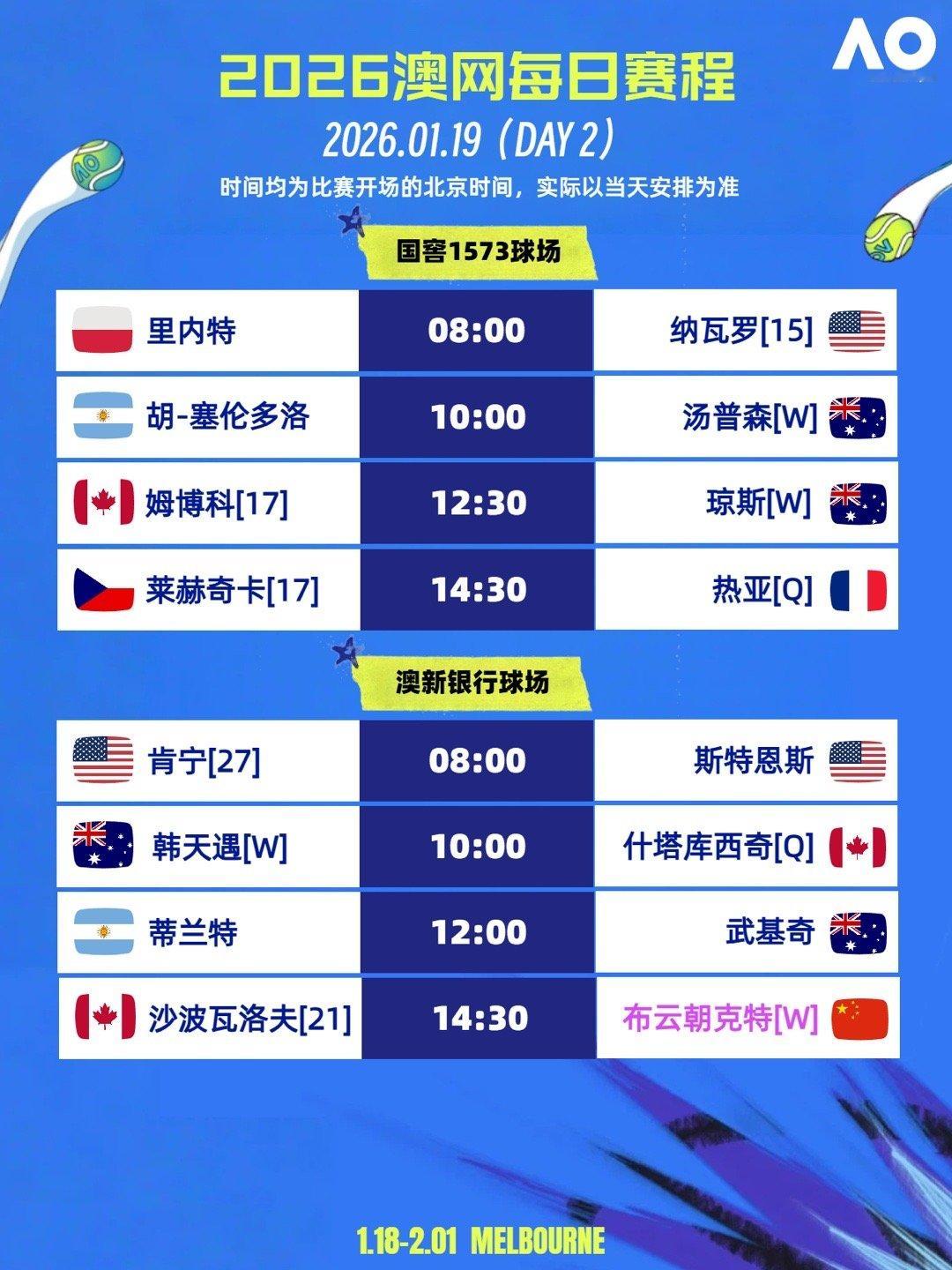 澳网澳网赛程 1月19日为澳网正赛第二日,将继续进行男女单打第一轮。🇺🇸高芙