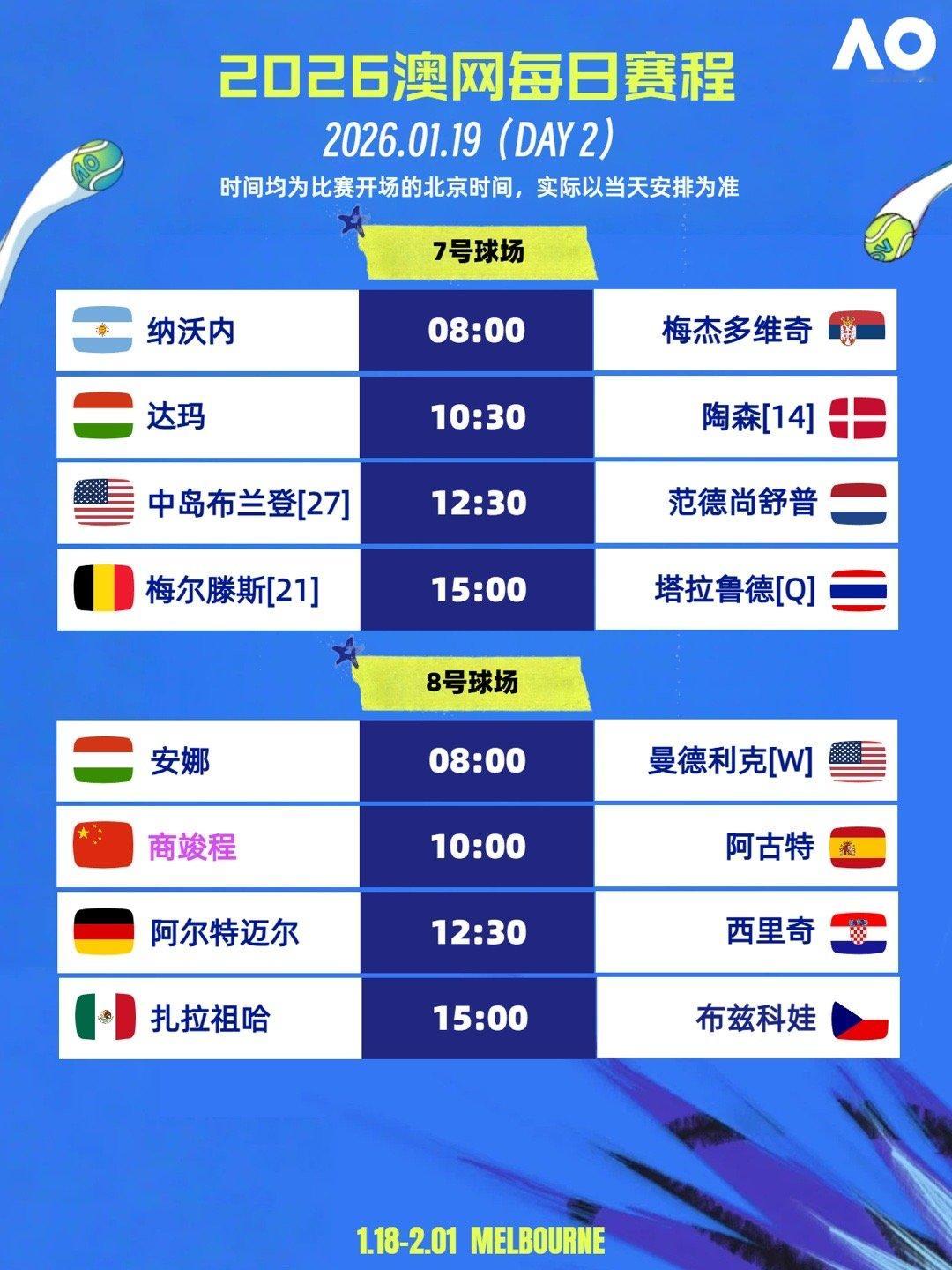 澳网澳网赛程 1月19日为澳网正赛第二日,将继续进行男女单打第一轮。🇺🇸高芙、🇵🇱斯瓦泰克、🇷🇸德约科维奇将亮相罗德·拉沃尔中心球场;🇷🇺梅总、🇷🇺安德烈耶娃、🇺🇸阿尼西莫娃将于玛格丽特·考特球场登场。🇨🇳中国球员明日将有3名球员亮相,2名将挑战种子球员:📍罗德·拉沃尔球场 16:00🇨🇳袁悦[Q] VS 🇵🇱斯瓦泰克📍澳新银行球场 14:30🇨🇳布云朝克特[W] VS 🇨🇦沙波瓦洛夫[21]📍8号球场 10:00🇨🇳商竣程 VS 🇪🇸阿古特