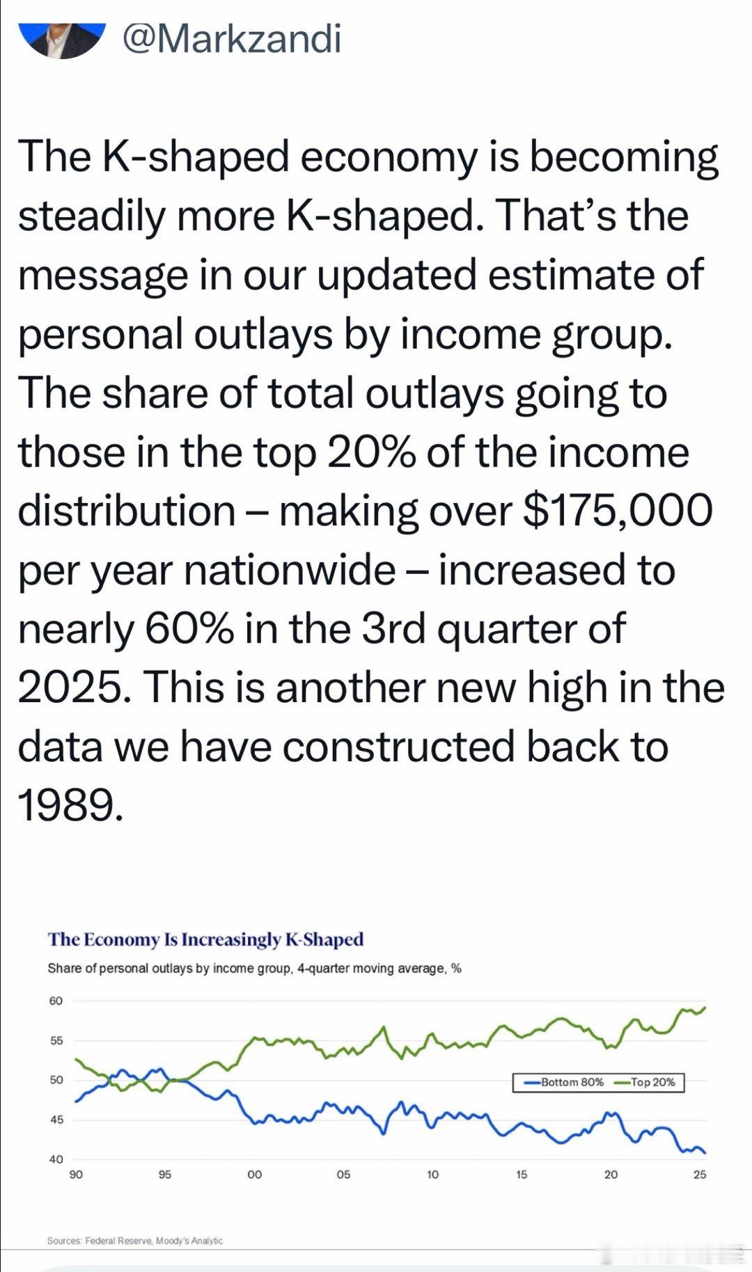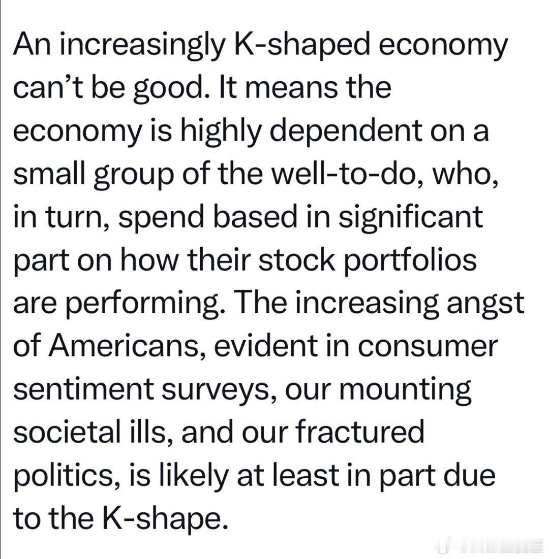 美国经济K形线:九十年代,收入最高的20%,个人消费占总量一半左右,其余80%占另一半;随后富裕阶层占比越来越高📈,其他人越来越低📉现在,前20%(门槛是年收入$17万5),消费占60%,其他人只占40%这意味着,经济靠少数人支撑,而多数人充满焦虑、缺乏信心对政治的分裂、社会的弊病,有影响