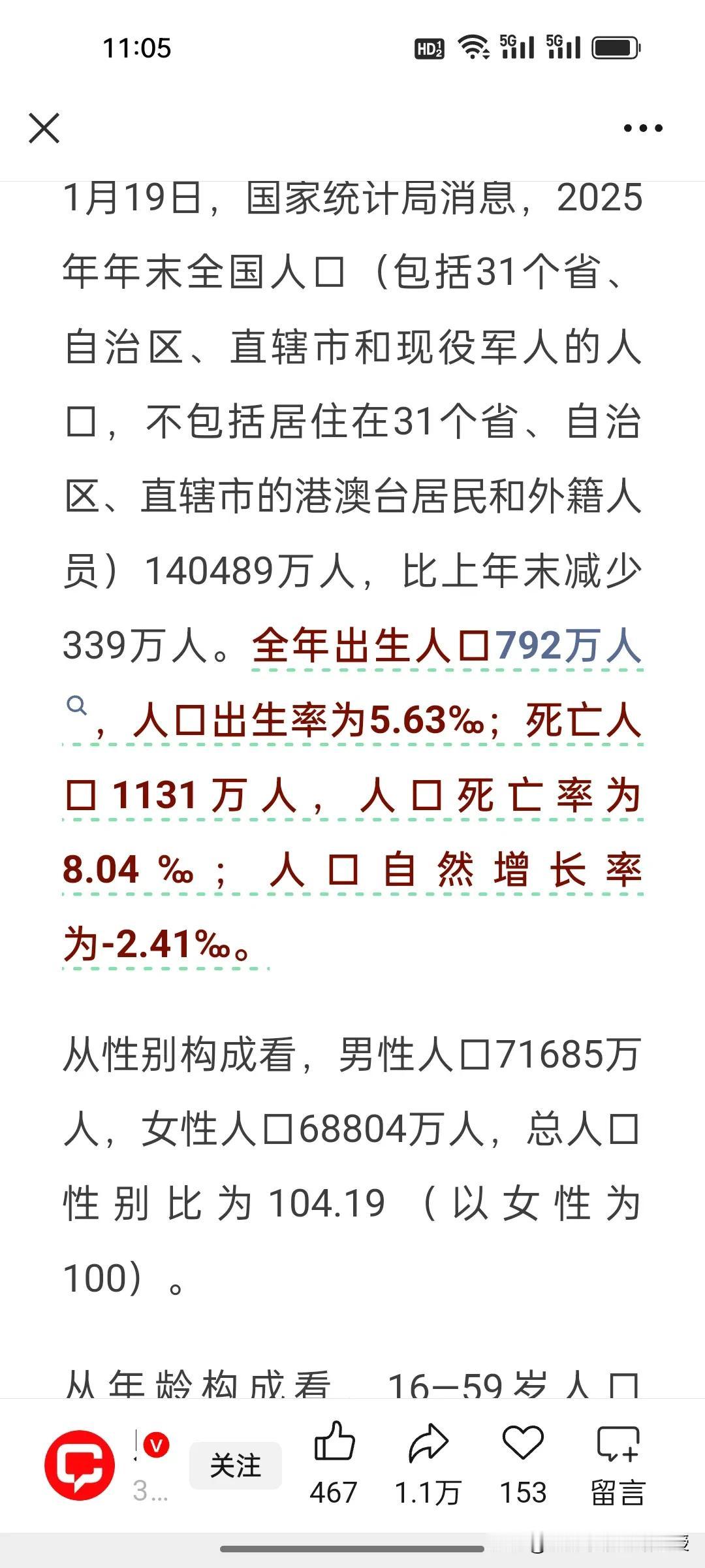刚刚,人口数据出炉!结婚人数反弹+政策加码,今年出生率要转正? 国家统计局最新通报:去年人口自然增长率-2.41‰,出生人口792万。但之前已经报道,去年全年结婚人数同比大涨17.3%,多地创5年新高,婚育意愿正在回暖! 从国家统一育儿补贴,学前班免费,到分娩“零自付”、住房政策向多孩家庭倾斜,生育支持已从口号变真金白银。今年大概率还有更多硬招:延长育儿假、优化托育服务、加大教育减负,全方位破解“生养难题”。 婚育热潮已起,政策红利持续加码,今年人口出生率转正值得期待!