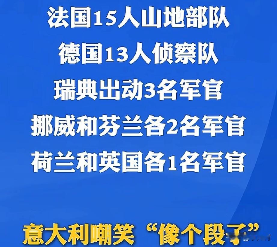活久见。欧洲七国(个)联军,抵抗美国入侵格陵兰,更好笑的一幕是,几个国家派出的士兵尽连一间美国教室都坐不满,法国15人,德国13人,瑞典3人,挪威和芬兰各2人,荷兰和英国各1人,意大利嘲笑“像个段子”。就问美国你“怕不怕”吧。