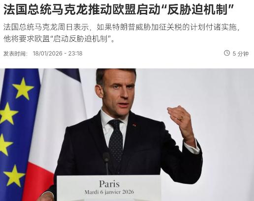 马克龙站出来了!法国总统马克龙表示,若特朗普加征关税的计划实施,欧盟将启动“经济核武器”反制美国!1月19日,根据法新社报道,法国总统马克龙表示,如果特朗普威胁加征关税的计划付诸实施,他将要求欧盟“启动反胁迫机制”。不得不说,马克龙提及的“反胁迫机制”是欧盟的一个杀招。   以前美国动不动拿关税大棒挥舞的时候,欧洲各国大多时候只能捏着鼻子认了,毕竟实力差距摆在那,谁也不愿意为了点关税把盟友关系搞彻底僵了。   可现在的世道不一样了,特朗普上次在任的时候,那是一点情面都不讲,连钢铝关税这种硬骨头都敢啃,根本不管你是不是所谓的盟友。   欧洲人这回算是学精了,也学狠了,要是再来这一套,绝不再搞什么“忍一时风平浪静”,而是直接准备掀桌子。   那个所谓的“反胁迫机制”,说白了就是给欧洲各国一把尚方宝剑,允许他们在面对外部经济胁迫的时候,能够迅速统一口径,收集证据,然后精准反击。   这就意味着,以前美国可能是挑个软柿子捏,现在只要敢动这一个,那就是动了欧盟这一大家子,报复的大棒会直接从布鲁塞尔抡到华盛顿去。   马克龙之所以这次反应这么大,也是被逼到了墙角。   法国那一票的红酒、奢侈品,还有德国的汽车机械,哪一个不是指着出口过日子?   要是特朗普真把60%甚至更高的关税挂出来,这些欧洲的拳头产品在美国市场上立马就得失去价格竞争力,那得是几千亿欧元的损失打水漂。   这哪里是简单的贸易摩擦,简直就是往欧洲经济的命门上捅刀子。   要是换了以前,可能也就是马克龙打个电话去白宫诉诉苦,或者派个特使去商量商量能不能给点豁免。   但这招对特朗普这种人来说,基本就是对牛弹琴,人家信奉的就是“美国优先”,你的痛苦人家压根不在乎。   既然好说好商量行不通,那就只能比比谁的刀快了。   欧盟这次磨刀霍霍,显然是做好了跟美国打一场贸易持久战的准备。   这招“经济核武器”也不是光吓唬人,里面包含的手段可多了去了。   一旦启动,欧盟不光是对等的加收关税,还能直接卡美国企业的脖子,限制那些美国的科技巨头在欧洲的业务,甚至连美国的金融服务都有可能被纳入制裁名单。   这对于那些深度依赖欧洲市场的美国公司来说,绝对是个噩耗。   想想看,要是没了欧洲这片肥田,苹果、谷歌、特斯拉这些巨头的财报估计都得难看一大截,到时候华尔街的股价一跌,美国国内的压力自然就上来了。   马克龙这招其实挺高明,他知道跟特朗普讲道理是讲不通的,唯有触碰到美国的实际利益,让对方感到肉疼,对方才有可能收手。   而且这次法国带头硬刚,也是在向欧盟的其他成员国展示一种姿态,那就是不能再任由美国摆布了。   以前总有人说欧盟是个“经济巨人、政治矮子”,在安全上靠美国,在经济上也看美国脸色。   现在看来,这种日子欧盟自己也不想过了,既然大哥靠不住,甚至还时不时敲诈小弟一笔,那小弟手里也得有点防身的家伙事儿。   这个“反胁迫机制”就是欧盟练出来的内功,虽然不敢说能一招制敌,但起码能保证自己被打的时候还能还手。   特朗普那边估计也没想到,还没正式上台,欧盟这边就已经把战书给甩过来了。   这位前总统一直以为美国只要一施压,盟友们就会乖乖就范,毕竟以前一直都是这么玩的。   但他低估了这几年国际形势的变化,也低估了欧洲人想要独立自主的决心。   现在的世界早就不是单极世界了,大家都在忙着搞自己的圈子,美国想一家独大、随意收割的日子正在一去不复返。   马克龙这次站出来说话,不光是为了保护法国的利益,更是为了保住欧盟这最后的体面。   要是连个“反胁迫机制”都不敢用,那以后美国还不得蹬鼻子上脸,今天加个税,明天退个群,后天再搞个什么制裁,那欧盟还混个什么劲。   所以,这一仗必须得打,而且还得打得有模有样。   这不仅是对特朗普的警告,也是给全世界其他想拿捏欧盟的国家提个醒,别以为欧洲人只会喝咖啡谈浪漫,真把人惹急了,反噬的力量也是相当惊人的。   这场即将到来的跨大西洋贸易博弈,估计有好戏看了。   一边是信奉“美国优先”特朗普,准备挥舞关税大棒大杀四方;另一边是手握“反胁迫机制”的马克龙,严阵以待准备反击。   这俩硬碰硬,最后到底是谁先眨眼,现在还真不好说。   不过有一点是肯定的,全球贸易的格局恐怕要因为这番较量,又要重新洗牌了。   对于咱们吃瓜群众来说,看着这两个西方巨头互相掐架,也算是开了眼界,原来所谓的盟友情谊,在真金白银的利益面前,也是脆弱得不堪一击。   马克龙这回算是把话挑明了,咱也不惹事,但绝不怕事,你要是敢乱来,那咱就祭出“经济核武器”,大家谁也别想过安生日子。   (信源:法新社 1月19日报道)