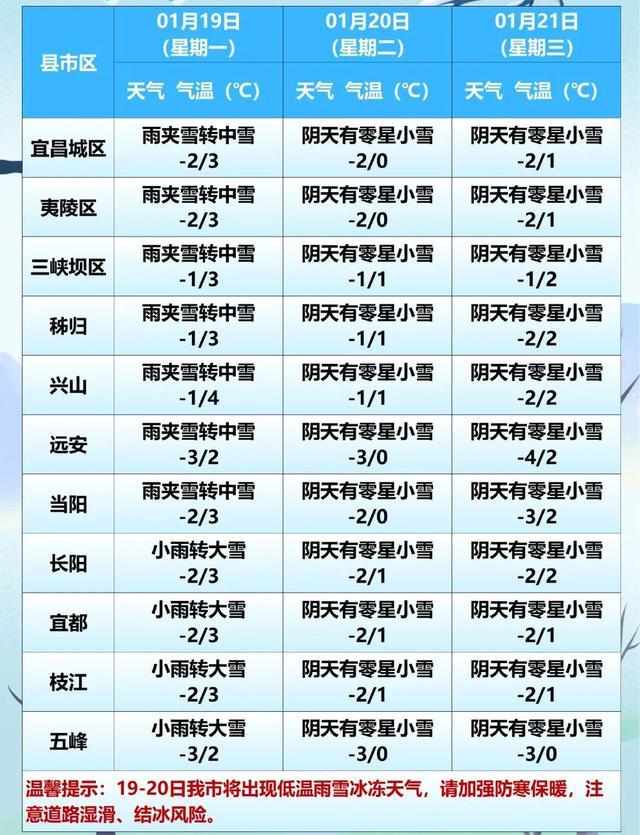 1月18日16时07分,宜昌市气象台发布寒潮蓝色预警信号:预计1月18日20时至21日08时,宜昌市将出现寒潮大风天气,并伴有明显雨雪。过程日平均气温下降7~10℃,21日早晨,低山平原最低气温降至-3~-1℃,高海拔山区可降至-8℃以下;期间东部平原、沿江河谷及高海拔地区将出现偏北风4~5级,阵风6~9级。