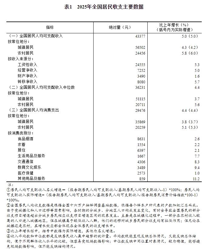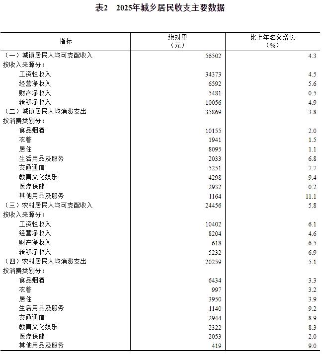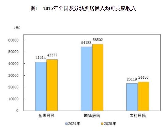 2025年,全国居民人均可支配收入43377元,比上年名义增长5.0%,扣除价格因素,实际增长5.0%。分城乡看,城镇居民人均可支配收入56502元,增长(以下如无特别说明,均为同比名义增长)4.3%,扣除价格因素,实际增长4.2%;农村居民人均可支配收入24456元,增长5.8%,扣除价格因素,实际增长6.0%。