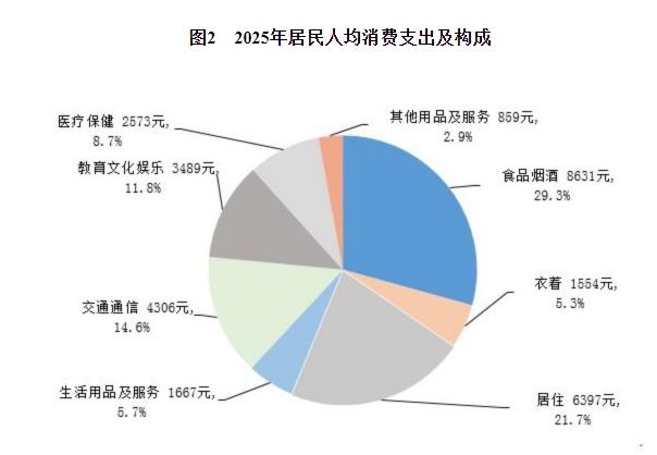 2025年,全国居民人均食品烟酒消费支出8631元,增长2.6%,占人均消费支出的比重为29.3%;人均衣着消费支出1554元,增长2.2%,占人均消费支出的比重为5.3%;人均居住消费支出6397元,增长2.1%,占人均消费支出的比重为21.7%;人均生活用品及服务消费支出1667元,增长7.7%,占人均消费支出的比重为5.7%;人均交通通信消费支出4306元,增长8.3%,占人均消费支出的比重为14.6%;人均教育文化娱乐消费支出3489元,增长9.4%,占人均消费支出的比重为11.8%;人均医疗保健消费支出2573元,增长1.0%,占人均消费支出的比重为8.7%;人均其他用品及服务消费支出859元,增长11.2%,占人均消费支出的比重为2.9%。