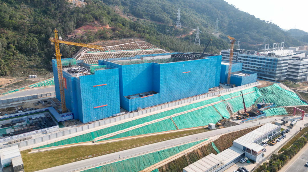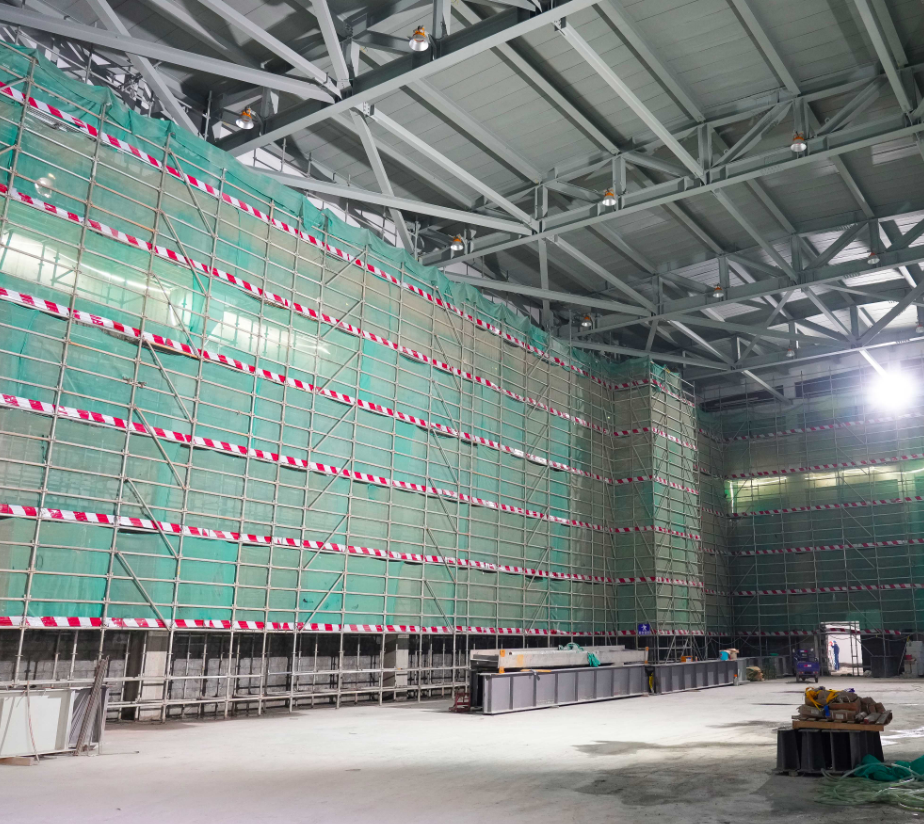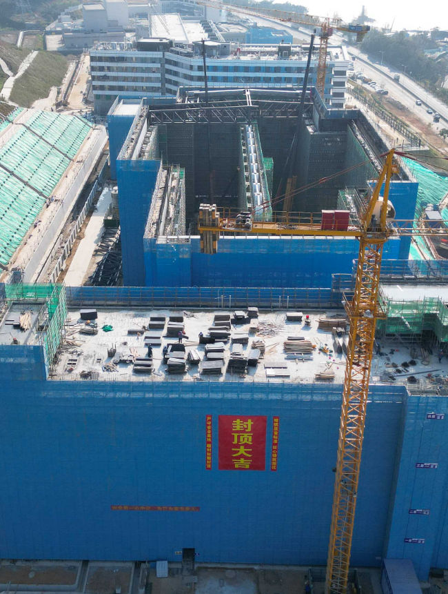 现场,控制楼、户内直流场、备品备件库等主体建筑正有序建设;1号井与2号井隧道施工同时进行,挖掘作业加速推进,为陆上电缆铺设打通路径。与此同时,陆上另一端——江门古劳换流站主控楼已封顶,阀厅网架提升工作已完成,为站内设备安装奠定了坚实基础。