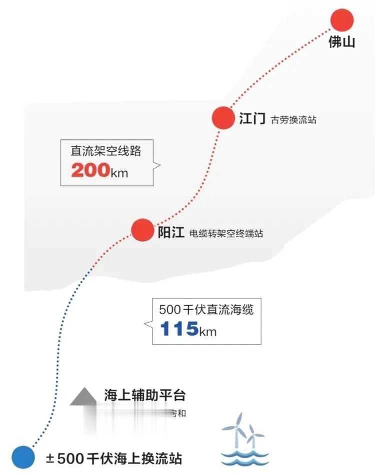 陆上工程则包含阳江海缆转架空终端站、江门古劳换流站,以及途经阳江、江门、佛山三地的近200公里架空线。