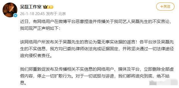 无锤造谣零容忍!吴磊工作室硬核维权,68分钟击碎“床照勒索”闹剧 1月18日晚,一条“网友喊话吴磊‘你欠我的拿什么还’,并称手握其床照公开叫卖”的消息突然引爆舆论,吴磊工作室严正声明等相关话题迅速登上热搜,引发全网热议。 事件发酵仅68分钟,吴磊工作室便火速发布官方声明,直接亮明态度:网传言论均为毫无事实依据的谣言。声明中明确指出,已委托律师完成全平台证据固定,将通过一切法律途径追究侵权者责任,同时敦促相关用户、媒体及平台立即删除虚假内容,停止扩散行为,字里行间尽显维权决心。 据悉,喊话吴磊的网友名为“白珊珊a”,其爆料全程只有文字造势,未放出任何照片、聊天记录等实质性证据,后续还以“爆锤”为噱头建群收费,收款后便解散群聊,套路直指诈骗。另有网友扒出《剑来》剧组通告单,证实白珊珊提及的“见面时间”里,吴磊正在浙江建德片场拍戏,行程公开可查,谣言不攻自破。 作为童星出道的演员,吴磊自2005年凭借《封神榜之凤鸣岐山》“小哪吒”一角踏入演艺圈,此后陆续出演《琅琊榜》《星汉灿烂》《长歌行》等多部爆款作品,凭借扎实的演技和清爽的形象收获大批粉丝。此次遭遇无底线造谣,粉丝纷纷表示支持工作室维权,呼吁“不信谣不传谣,让造谣者付出应有的法律代价”。 从光速辟谣到强硬维权,吴磊工作室的操作堪称内娱危机公关范本。这起事件也再次提醒大众:网络不是法外之地,借明星热度造谣勒索,终将难逃法律制裁;而作为吃瓜群众,“无锤不信”才是守护网络清朗的基本准则。 吴磊 白珊珊a