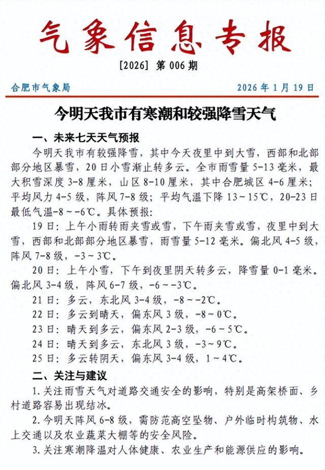 19日:上午小雨转雨夹雪或雪,下午雨夹雪或雪,夜里中到大雪,西部和北部部分地区暴雪,雨雪量5-12毫米。偏北风4-5级,阵风7-8级,-3~3℃。