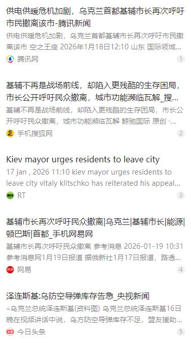 这一次乌克兰真的是挺不住了,他倒在了第4个冬天。最新消息,基辅城的市长克里琴科,已经开始号召市民,离开这座城市。目前基辅城大量的城区,已经失去了基本的城市功能。 麻烦看官老爷们右上角点击一下“关注”,既方便您进行讨论和分享,又能给您带来不一样的参与感,感谢您的支持!   2026 年的冬天,俄乌冲突迈入第四个年头,乌克兰首都基辅没能扛过这场漫长的寒冬。当地时间 1 月 9 日起,基辅市长维塔利・克里琴科连续发出呼吁,让有条件的市民尽快撤离这座基本丧失城市功能的首都,这是冲突爆发以来首次有如此明确的撤离号召。   1 月 9 日夜间,俄军发起大规模空袭,36 枚各型导弹搭配 242 架自杀式无人机精准打击了基辅的高压变电站、调度中心和供暖枢纽。尽管乌军奋力拦截,但仍未能阻止能源基础设施遭受毁灭性打击,这座城市的命脉就此断裂。   空袭过后,基辅超过 6000 栋公寓楼失去供暖,41.7 万户家庭陷入断电困境。供暖管道破裂后,高温热水在零下十几度的严寒中迅速凝结,整段管道网络变成冰柱,抢修工作在持续威胁下几乎无法推进。   供水系统因依赖电力加压也全面停摆,市民只能凿冰化雪或排队接水度日。地铁全线停运,超市大多关门歇业,仅存的小店靠发电机维持,货架空空如也,少量商品价格飙升到普通人难以承受的水平。   乌克兰能源部 1 月 16 日宣布全国进入能源紧急状态,基辅的户外照明被严格管制,路灯亮度下调,建筑装饰照明和户外广告全部暂停。夜晚的基辅陷入一片黑暗,只有偶尔驶过的车辆灯光能短暂划破寂静。   零下十七度的严寒中,撤离成了许多家庭的无奈选择。出城道路排起长龙,人们把简单的家当塞进汽车,带着老人和孩子朝着相对安全的西部方向前行。没有交通工具的家庭,只能背着行囊在寒风中徒步,前路充满未知。   国际援助的短缺让困境雪上加霜。美国中止了对乌军事和安全援助,欧盟 900 亿欧元的援助贷款陷入长期扯皮。防空导弹库存耗尽,“爱国者” 系统成了空架子,无法有效拦截高超音速导弹,救援车队也因路况和安全问题难以顺利抵达。   市政府开放的避难所早已超负荷运转,人们挤在一起排队领取热食和充电机会。瓶装水、药品和燃料成了紧俏物资,黑市上一小捆木柴的价格堪比两瓶伏特加,小型太阳能充电板成了家庭必备的 “硬通货”。   并非所有人都能顺利撤离,大量老人、病人和无力负担迁徙成本的家庭选择留守。他们用塑料布密封窗户缝隙,在客厅搭起简易炉灶,靠着战前储备的罐头食品和融化的雪水维持生计,每天都在与严寒和匮乏抗争。   留守的市民自发组织起来,冒着导弹警报的风险修补破裂的水管,在废墟中寻找可燃烧的木材,为邻居搬运稀缺的燃料。他们的抢修工作常常刚有进展,就可能遭遇新一轮空袭,只能在破坏与修复的循环中反复挣扎。   俄军的战术早已改变,不再追求大规模人员伤亡,而是采用 “钝刀子割肉” 的方式。等抢修人员接近完成修复时,就发动新一轮精确打击,既消耗物资人力,也消磨着民众的意志。   乌克兰本就老化的苏联时期基础设施,经过四年冲突的反复打击,早已不堪重负。后方民用设施的维护资金被大量挪用至前线,临时修复的设施在新一轮打击下不堪一击,系统性修复更是遥遥无期。   医疗系统濒临崩溃,大型医院只能靠储备柴油发电机维持手术室和重症监护室运转。普通病房的患者和医护人员裹着所有能找到的御寒衣物,常规诊疗服务大幅缩减,小病拖成大病的情况屡见不鲜。   基辅的困境是整个乌克兰的缩影,第聂伯罗、哈尔科夫等城市也面临着类似的能源危机。联合国数据显示,乌克兰全国有超过 1100 万人需要紧急人道援助,其中大部分需求都源于供暖、供电和供水系统的崩溃。   这场战争早已超越了前线的交锋,变成了对后方民众生存意志的考验。曾经繁华的千年古城,如今脉搏日渐微弱,街道上看不到往日的活力,只剩下寒风卷起积雪的萧瑟景象。   克里琴科在采访中坦言,这是基辅历史上首次在如此严寒中大面积停暖停电,基础设施的压力已经达到极限。他的撤离呼吁,既是对现实的无奈承认,也是为了减轻城市负担的必要举措。   留守市民的坚守透着令人动容的韧性,他们在黑暗中点燃希望的微光,用互助和坚持对抗着绝望。但这份韧性背后,是难以承受的苦难,是对和平的迫切期盼。   第四个冬天的基辅,用破碎的基础设施和民众的艰难求生,诉说着战争的残酷。这座城市的遭遇被铭刻在世界记忆里,不仅是冲突的缩影,更是对和平价值的深刻诠释。   寒冬尚未过去,危机仍在持续。基辅的命运牵动着世界,人们期盼着这场漫长的冲突能早日结束,让流离失所的人重返家园,让这座饱经沧桑的城市重新找回光明与温暖。
