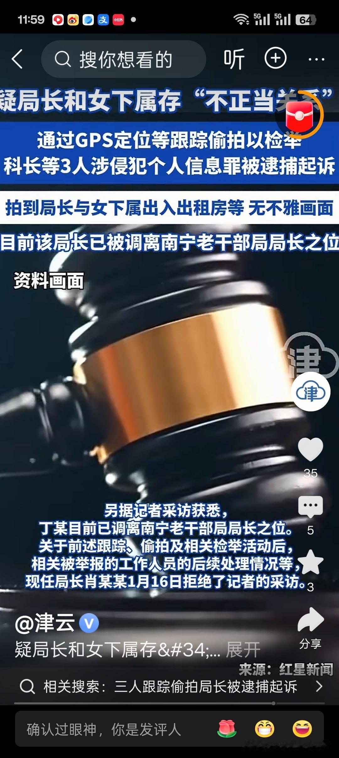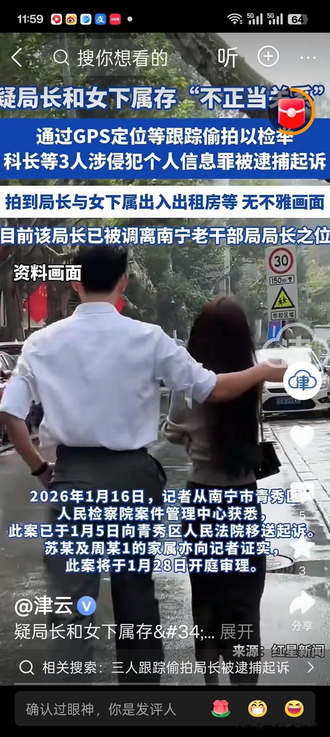 南宁老干部局科长苏某因认为局长丁某对其“不公”,且怀疑丁某与女下属有不正当关系,伙同周某1、周某2跟踪偷拍丁某,非法获取其轨迹信息117条及视频、照片若干。 检察机关以侵犯公民个人信息罪起诉三人,案件将于1月28日开庭,丁某已调离原岗位。 这起案件清晰划定了公民监督权与个人信息保护的法律边界。 苏某因工作不满与主观怀疑,便伙同他人用GPS定位、安装摄像头等方式非法偷拍,获取的轨迹信息远超“情节严重”的50条立案标准,已构成刑事犯罪。 公职人员的履职行为应受监督,但监督绝不能逾越法律红线。即便举报内容属实,偷拍、跟踪等非法取证手段也会触碰法律底线,正如类似案例所示,不能因举报目的正当就豁免非法行为的责任。 苏某作为公职人员,本应懂法守法,却因个人情绪滥用权力相关信息,更显荒唐。 此案警示世人:维权需循合法途径,举报应依托纪检监察等正规渠道。 无论是普通公民还是公职人员,都不能以“监督”为名侵犯他人隐私与个人信息。 唯有在法律框架内行使权利,才能既维护自身合法权益,又守护社会的法治秩序,避免从“维权者”沦为“违法者”。南宁那件事