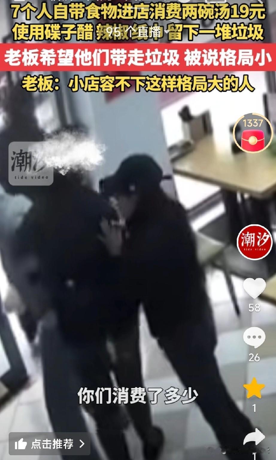 上海,7名顾客在一家小吃店吃饭,就点了两碗汤,消费19元。因为他们自带了食物,老板说吃完后看他们留下不少垃圾,就提醒他们把垃圾带走。 几个顾客都走到门口了,听到老板这样说,也是有点心里不爽。有个男顾客嫌老板说话态度不好,说她做生意格局小了。 老板本来看到他们消费就少,还吃了店里不少的辣椒油和醋,把餐桌上搞的一团糟,心里就有怨气。 听到顾客这样说,老板也很生气,她说自己是开店的,房租、水电、人工都要钱。说她格局小,如果都像这几个顾客这样,她得赔钱。 有网友同情老板,说去饭店吃饭自带食物,占座位不说还消费少,这点确实挺不地道。人家老板也需要赚钱?又不是搞慈善的。 有网友说,开门做生意,就要和气生财,才能生意好。他们可能也有自己的原因,如果没有空座,可以不让待,如果正好有空座,去的人多,给店里增加点人气,也是挺好的。 我觉得老板也没必要这么生气,你如果觉得这种事你不能接受,可以贴个字条,说不能再带食物,这样矛盾就解决了。 对于这件事,你怎么看呢?