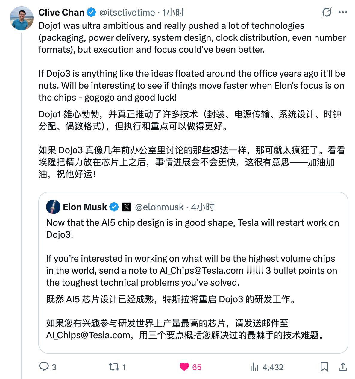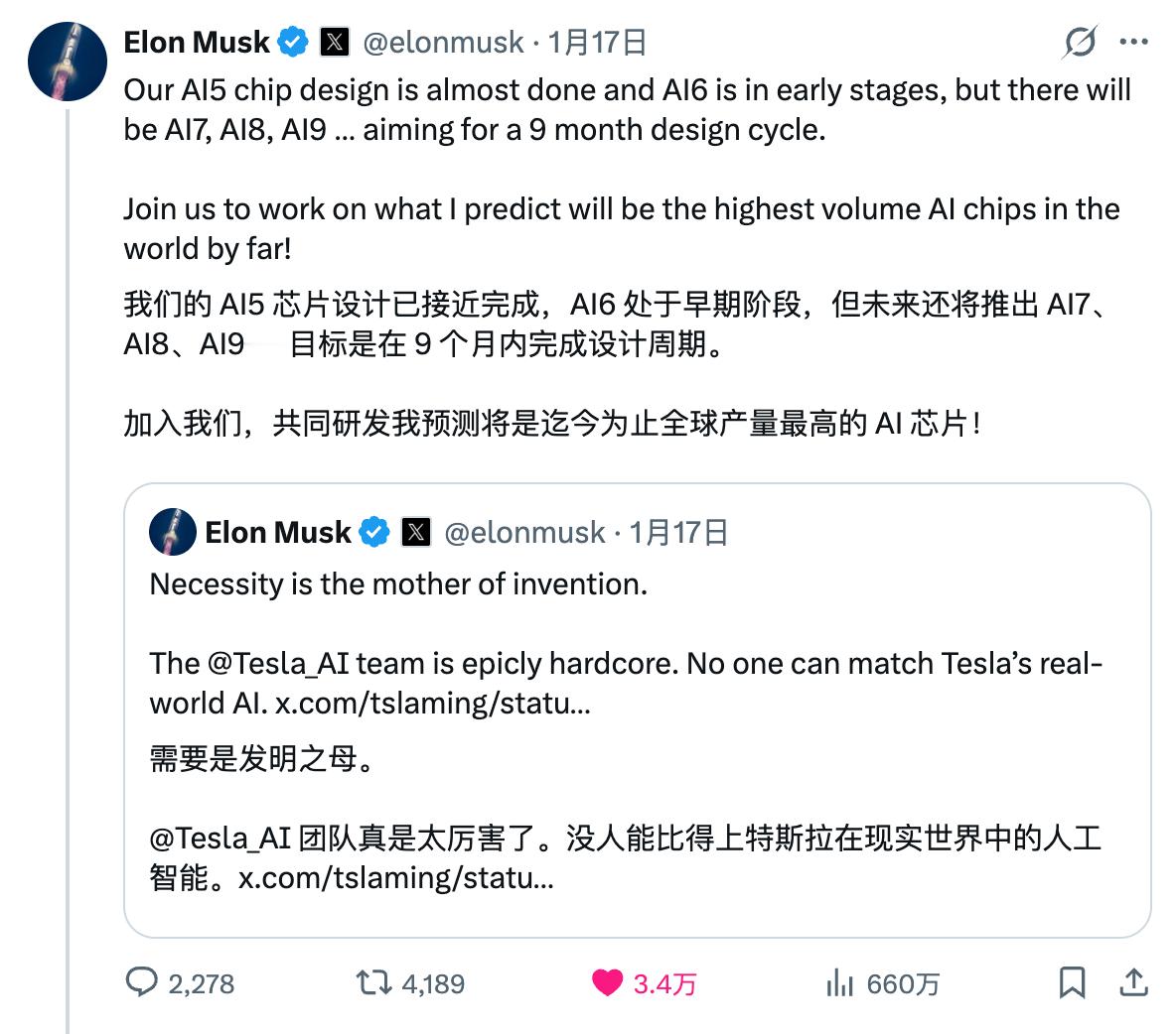 Elon Musk 今天连发多条评论特斯拉的芯片规划。- 目前特斯拉 AI5 设计接近完成,未来的目标是在 9 个月内完成一代芯片的设计工作。- 从性能上来说,AI4 能达到远超人类安全的自动驾驶安全水平(这个表述比较模糊,不如直接说无需监督的自动驾驶)。AI5 将使车辆的自动驾驶性能接近完美,并全面适配 Optimus 人形机器人的计算需求。AI6 将应用于 Optimus 机器人和数据中心,这表明 AI6 可能是推训一体的设计,也说明 AI5 某种程度上算是特斯拉自动驾驶芯片的最后一代。AI7 和 Dojo 3 将应用于太空超算,因此在芯片可靠性和耐久性方面恐怕要考虑太空环境。特斯拉也借此重启了 Dojo 3 的研发工作。- 为了支持自己的芯片需求,特斯拉也在建设自己的 Terafab 芯片制造工厂,2025 年的股东大会上 Elon 对此的解释是,通过接触三星和台积电,特斯拉意识到 2027 年后特斯拉的最大瓶颈会是芯片供应,三星和台积电的现有产能无论如何都无法满足特斯拉的需求,所以除了自建工厂别无他法。