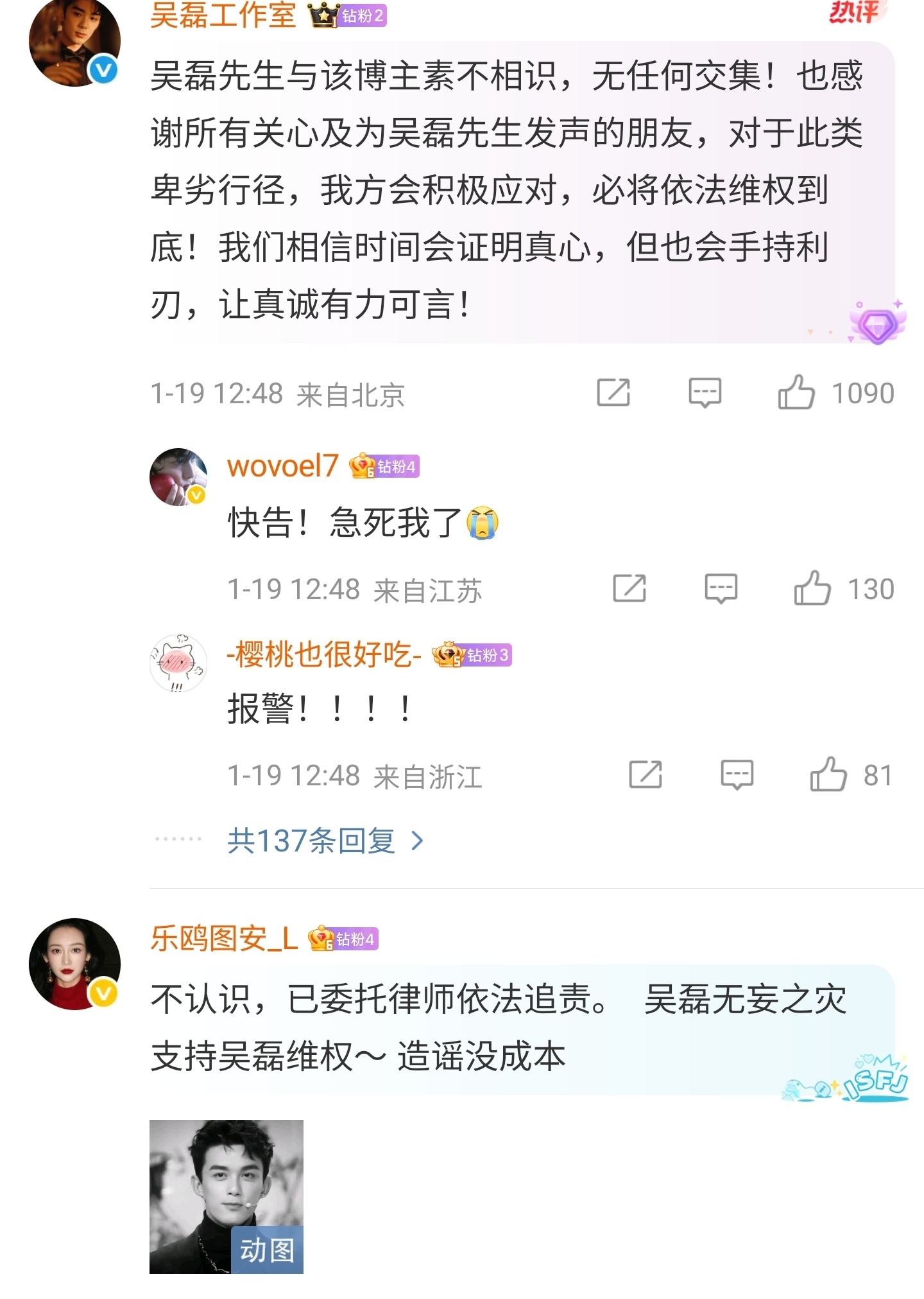 吴磊演员吴磊直接在个人账号上发文,明确表示自己跟那个爆料的白女士不认识,已经委托律师依法追责。听吴磊这个口气,应该是确实被冤枉了,要不然他不可能在这个节骨眼上这么直白的否认。那么问题来了,那个白女士之前是闹的哪一出,为什么娱乐圈那么多明星她不提,偏偏提吴磊呀?