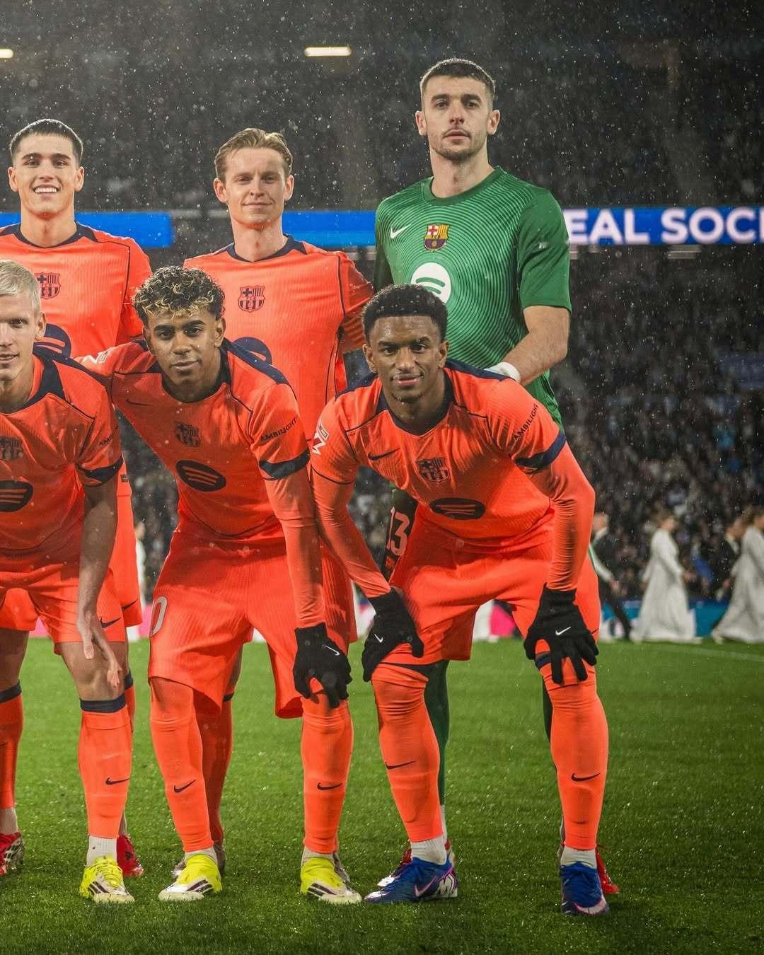 巴萨首发11人合影。皇家社会2比1巴萨西甲
