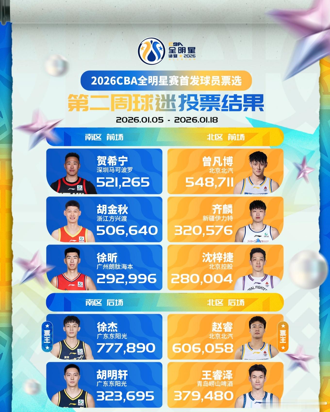2026CBA全明星赛第二周票数公布,徐杰稳坐票王宝座,他领先赵睿的优势扩大到17万张。南区后场庞峥麟被胡明轩反超,北区前场周琦被沈梓捷反超。虽然从个人数据、出场场次、球队成绩等层面来看,有些全明星的入选引发争议。但全明星投票又不是最佳阵容评选,比拼的就是人气和号召力,所以粉丝的选择无可厚非。鉴于本赛季表现出色的本土球员没那么多,那些有实力且表现出色的球星必然会被挑入替补阵容,所以不必过于忧虑。而有些球星如果不能靠球迷投票直接进入首发,那大概率就会落选,从这个角度来看,部分人气球星负责首发卖票,实力球星负责比赛撑住场面,分工明确、各司其职、各美其美,这不就是多赢嘛。2026cba全明星周末
