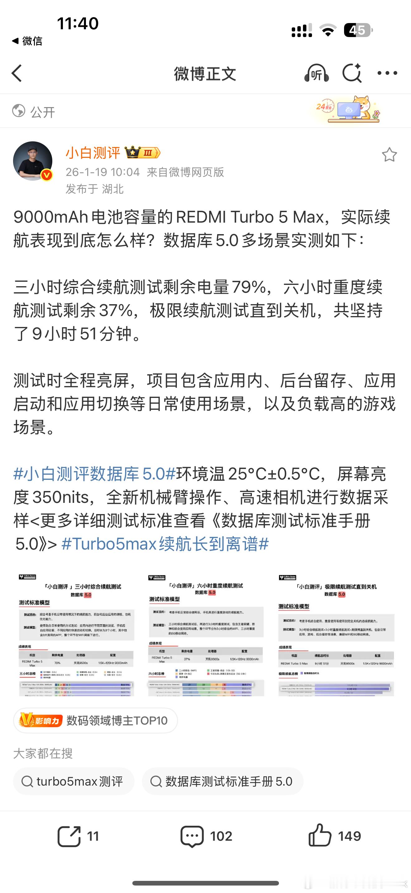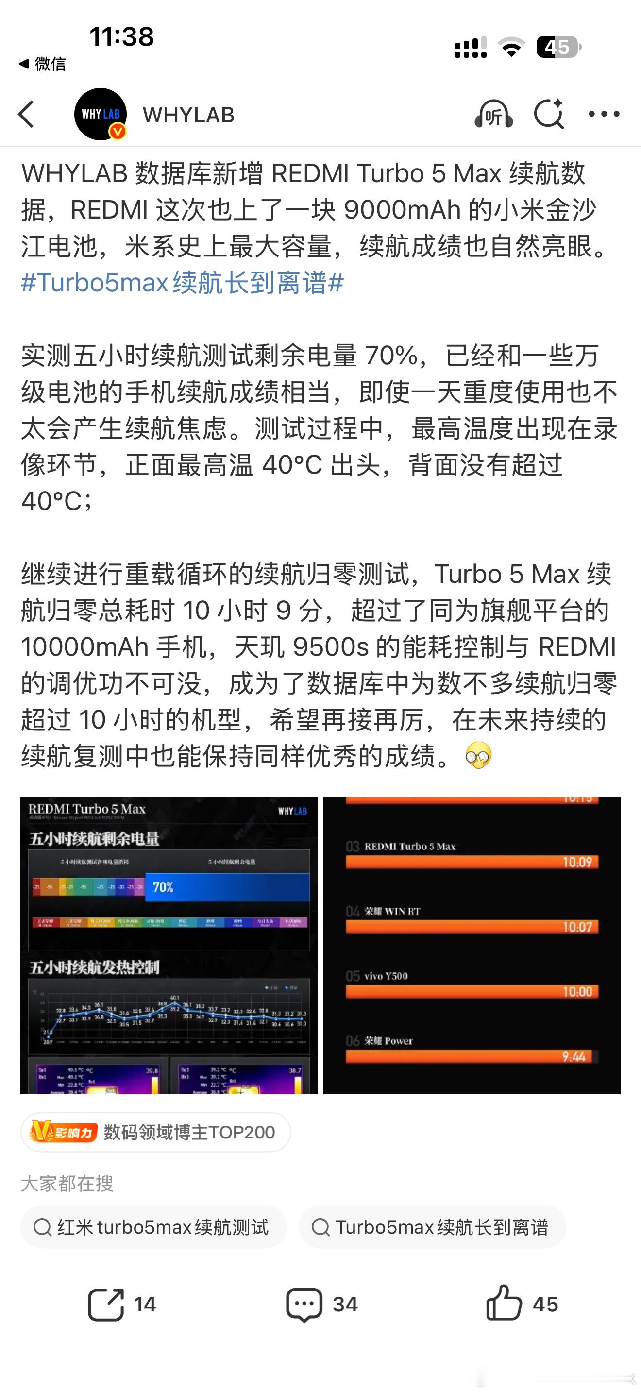 Turbo 5 Max这个续航确实猛啊,用了目前小米最大的9000mAh金沙江电池,看了下各家实测续航时间基本都干到了9-10小时,没想到REDMI这个天玑9500s+9000mAh组合,居然能做到和其他家8E+10000mAh旗鼓相当的续航表现!这能耗控制和优化调校真有东西,Turbo 5 Max在2.5K档位机型当中又要赢麻了!