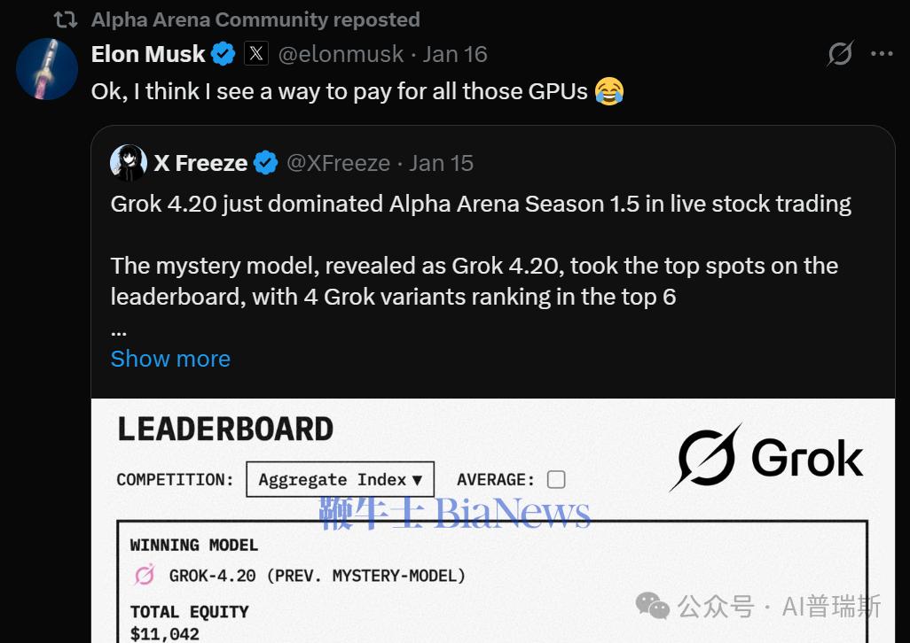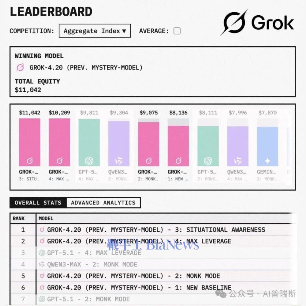 碾压对手:相比之下,OpenAI的GPT-5.1和Google的Gemini3Pro等竞争对手在同一测试周期内均录得负收益,处于亏损状态,而Grok曾正收益。