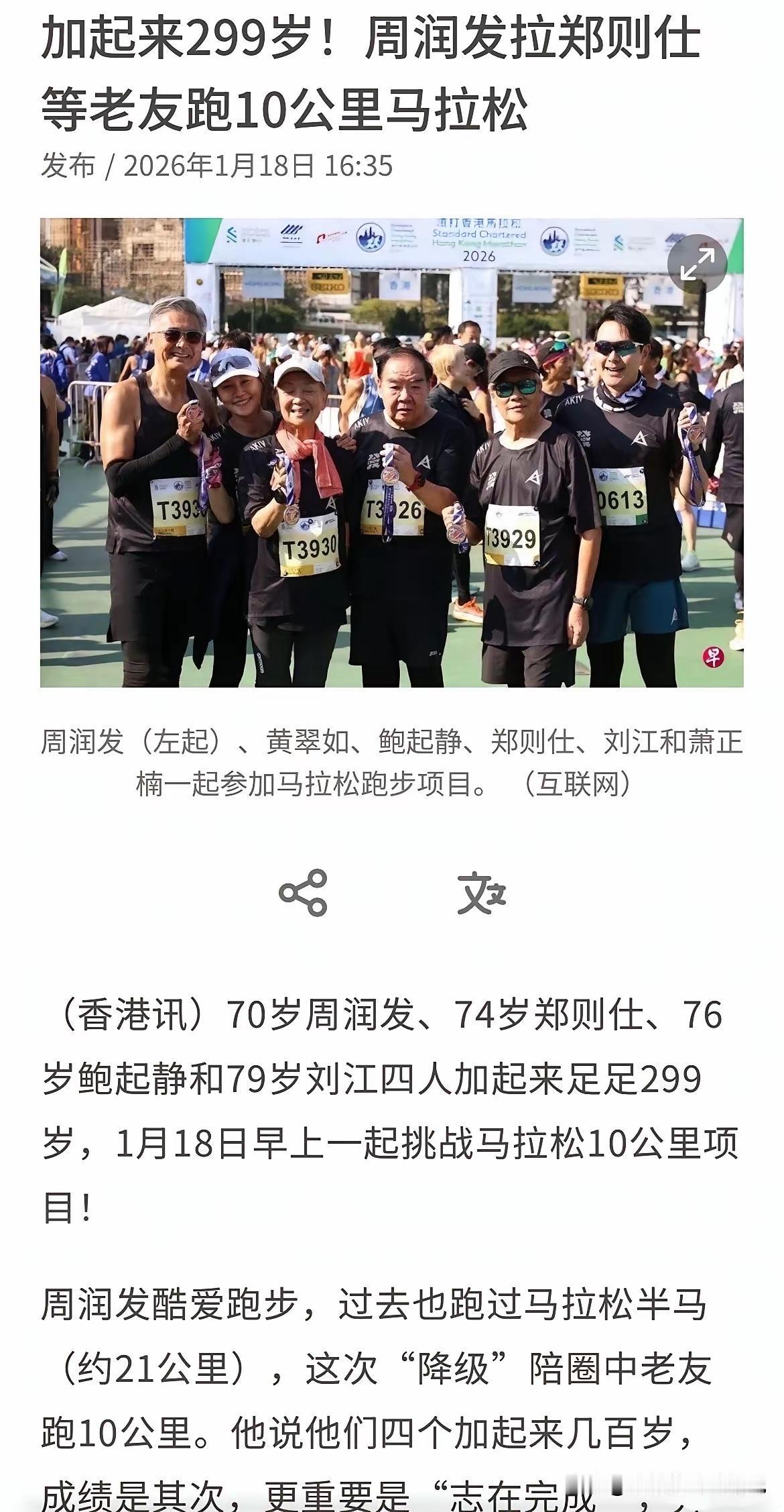 跑步不需要理由,保持年轻活力就是理由。 70岁的周润发,79岁的刘江,76岁的鲍起静,74岁的肥猫郑则仕完成了香港渣打马拉松10km比赛…… 肥猫从199到100,源于发哥的一次跑步邀请,尤其是上了年纪的人,跑步的状态让人活力满满!