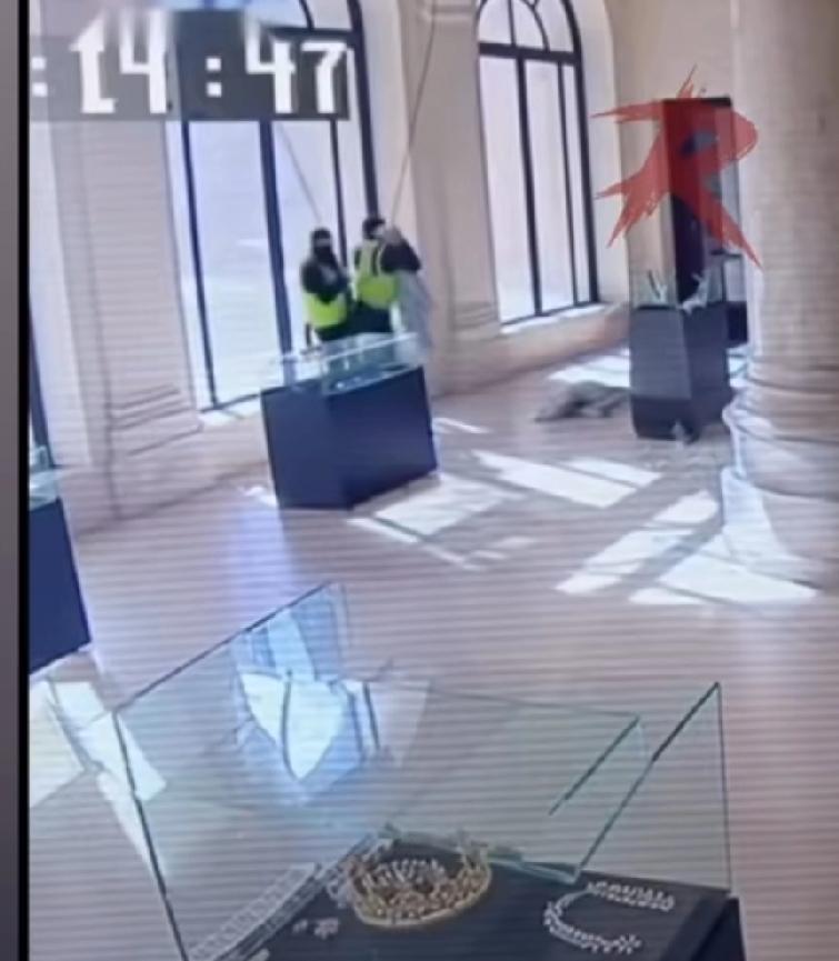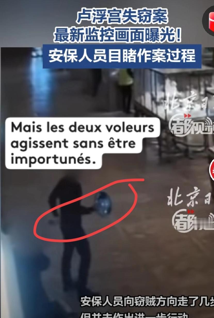 去年卢浮宫失窃,盗窃手段竟如此原始而朴素。窃贼嫌机器不好使,化身“铁臂阿童木”,直接用拳、用肘破障取宝。 穿黄马甲这位明显比第二个生猛,他在砸穿防护罩拿到欧也妮王后的王冠后,又跑到另一展柜帮同伴清货。 那些平时待在罩子里安静享受注目与赞美的珠宝们,在那一刻都成了贵又普通的物件,被人粗暴地取走。 欧也妮王后的王冠甚至被大盗们落在了外面的地上,不变形都难。 几分钟内,窃贼在撒欢儿,安保人员看着。 他们也很紧张,有个人拿起个小家伙往前走了走,又马上放弃了。 防护玻璃不行、安保不行、防范意识不行,卢浮宫失窃案,完全可以拍成电影。