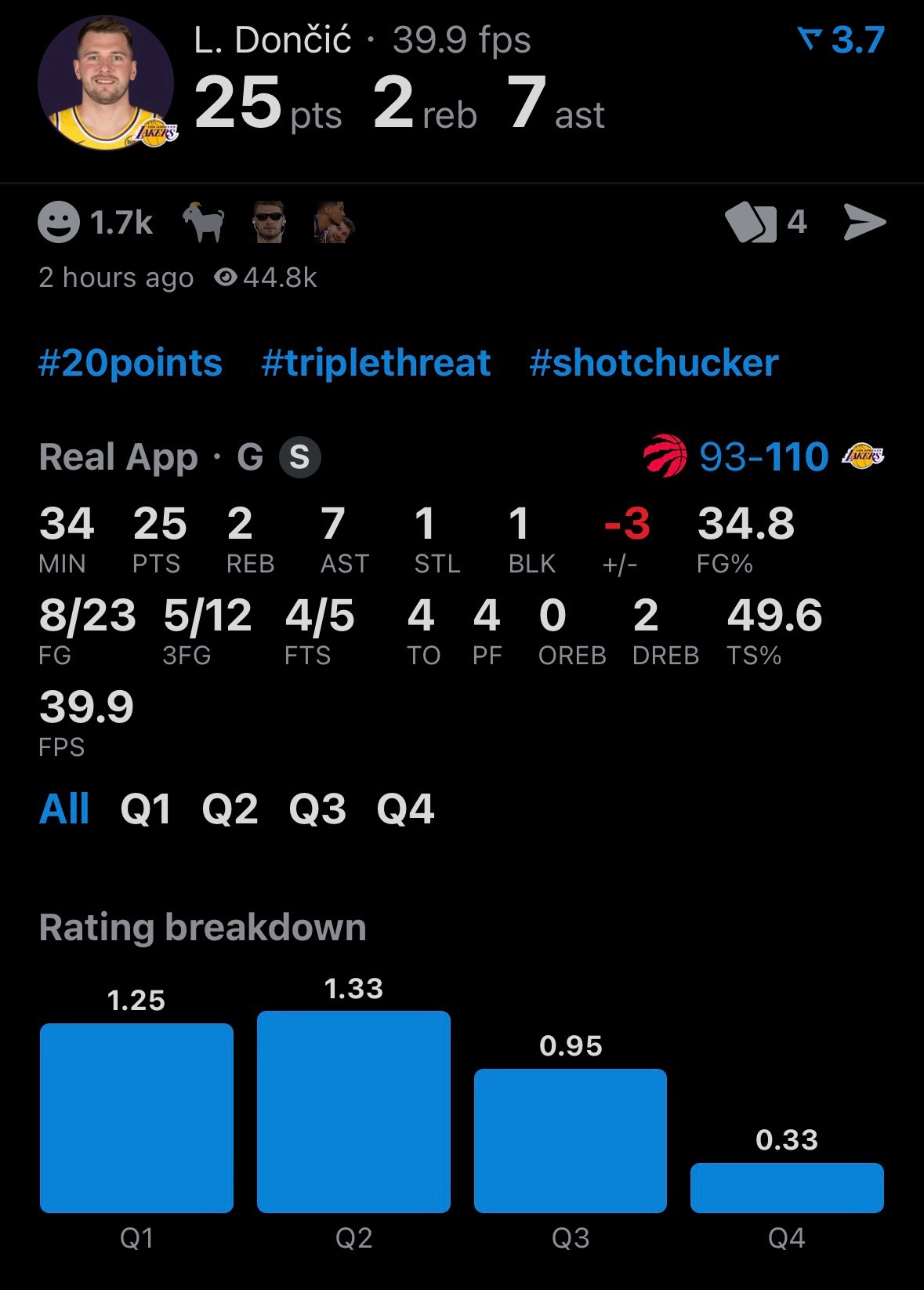 东契奇谈腹股沟伤势时说:“没事,不算太糟。”并且称赞了今天的防守:“我认为这是我们打得最好的一场防守比赛之一……我们打得很有侵略性,速度也很快,我认为我们今天做得非常出色。”猛龙vs湖人