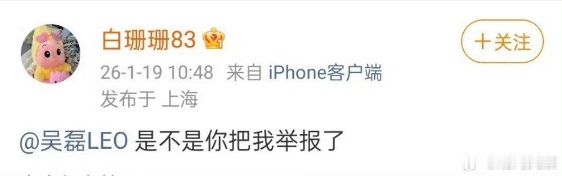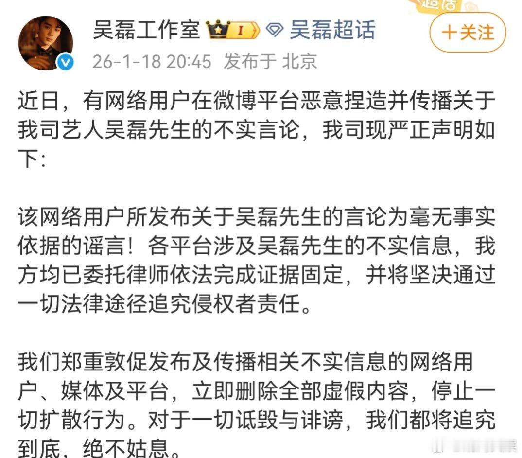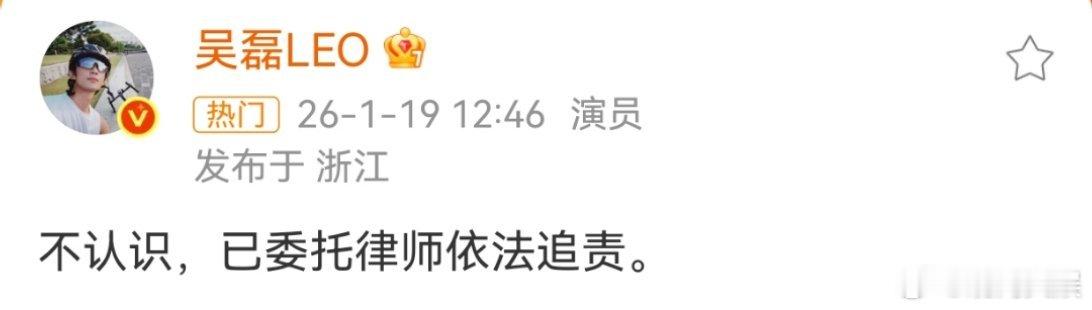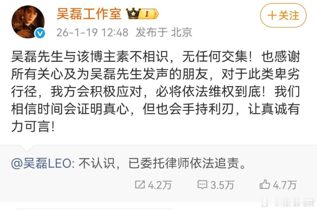 吴磊 不认识1月18日,白珊珊喊话“吴磊你欠我的拿什么还”,引发热议。吴磊工作室回应称该网络用户所发布关于吴磊先生的言论为毫无事实依据的谣言,工作室将通过法律途径追究责任。 18日,发文回应:“不认识,已委托律师依法追责。” 随后,转发并评论:“吴磊先生与该博主素不相识,无任何交集!”还称将依法维权到底。吴磊 白珊珊
