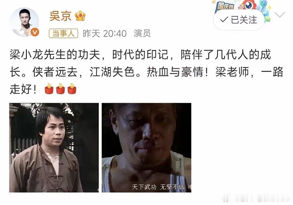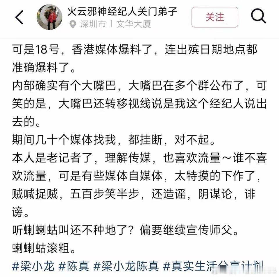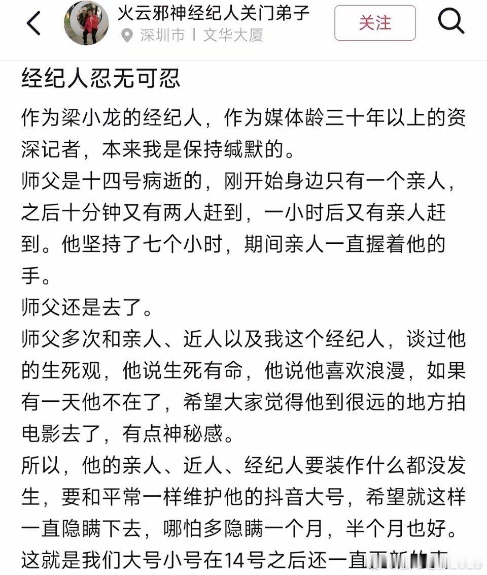 火云邪神梁小龙 梁小龙经纪人凌晨发文,透露师父去世细节,未及时公布死讯原因曝光!1月19日,凌晨,梁小龙经纪人(网名:火云邪神经纪人关门弟子)在社交平台发文,看完内容,有些疑惑迎刃而解。经纪人尊称梁小龙为师父,由此可见,关系非常好,账号头像都是两人的合影。据经纪人透露,梁小龙于1月14日病逝,不过,具体病因未提及,当时亲人一个又一个的赶来,亲人握着梁小龙的手,师父坚持了七个小时。咱就说,梁小龙在生命的最后一刻,有众多亲人陪伴,应该没有遗憾了。此外,经纪人表示,梁小龙早就和亲人谈及生死观,已看淡一切,如果哪天不在了,希望亲朋好友就当什么都没发生,社交账号继续更新,保持一份神秘感。说实话,真的很佩服老先生的心态,可惜还是永远的离开了。至此,很多疑惑解开了,第一,经纪人透露师父病逝,显然,这并不突然。第二,媒体发布去世消息当天,梁小龙账号还在更新,原来,早有遗愿。此外,经纪人用忍无可忍来形容,痛斥有人真的大嘴巴,在群里公布了死讯,言语间特别的气愤。不得不说,梁小龙去世,让人深感惋惜,就连成龙、吴京、周星驰都发文悼念。愿逝者安息,一路走好!