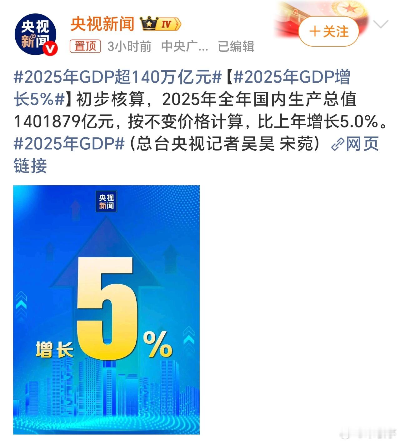 喜讯!2025年GDP增长5%,完成了年初定下的增长目标。国家统计局发布数据