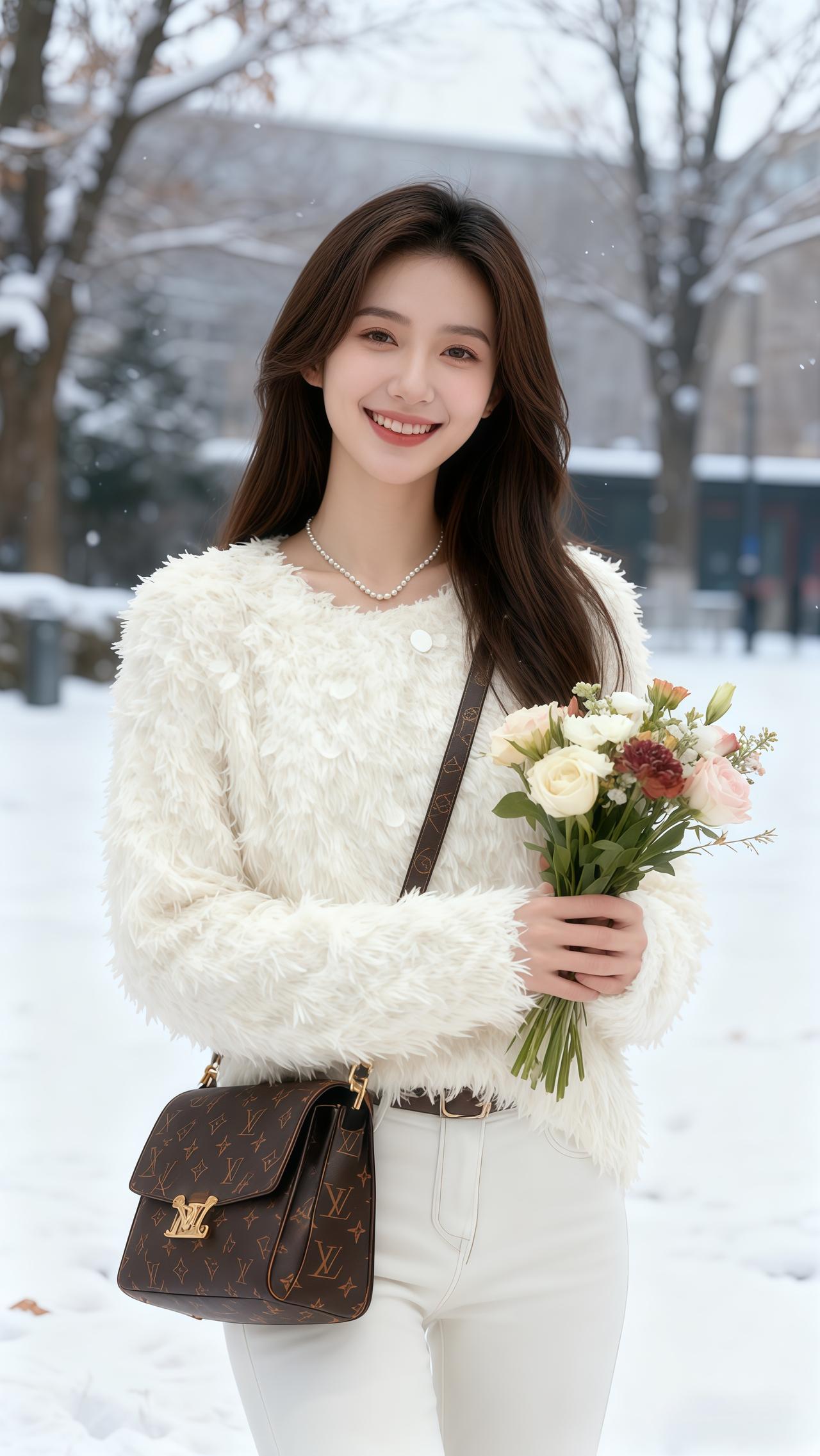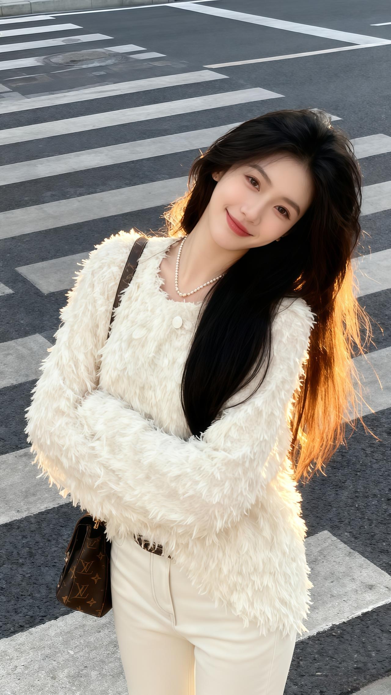 白色短款毛衣搭配毛绒短裙,优雅又俏皮,完美展现时尚感!
