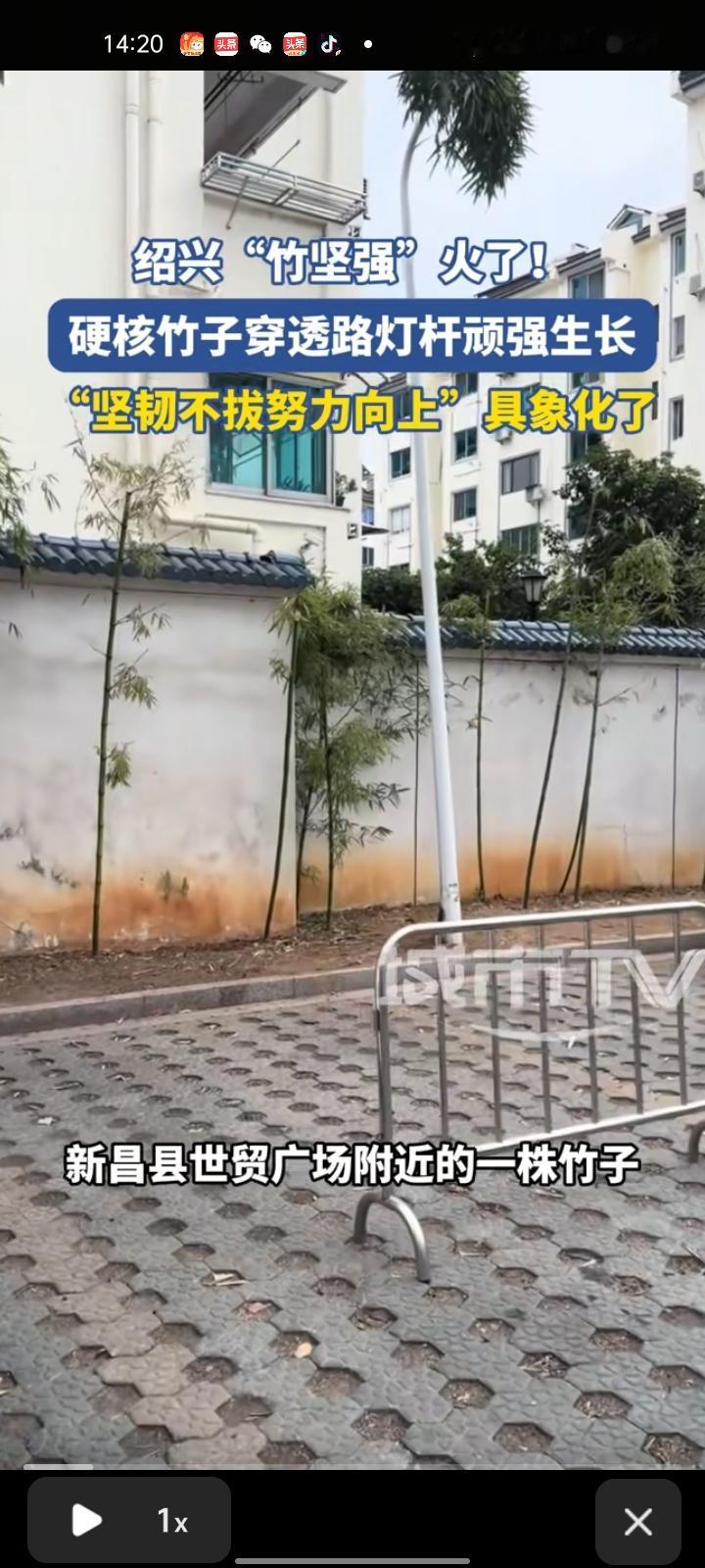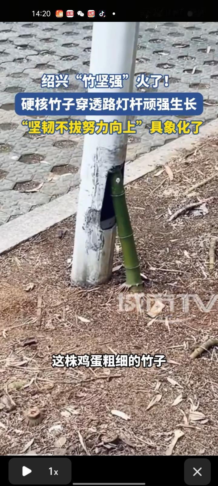 1月19日,绍兴市新昌县。世贸广场附近的一株竹子从灯杆底部缺口钻进去,在五六米长的灯杆内部向上生长,最终从顶端探出枝叶,长势繁茂葱郁。 拍摄者贾先生介绍,几天前带孩子路过此处,偶然发现这一奇景,随手拍下视频分享到网上,没想到迅速引发关注。如今,这里已成为网红打卡点,不少市民纷纷前来拍照,当地城管和绿化部门已前往查看,确认竹子不影响使用和行人通行,决定暂时保留。
