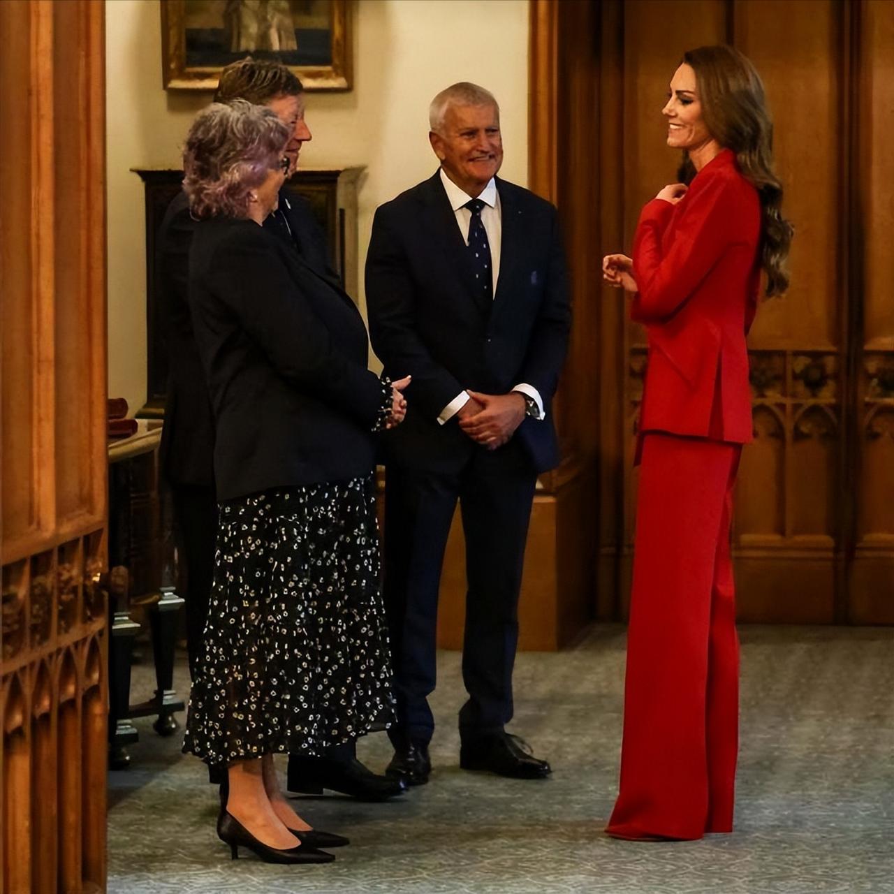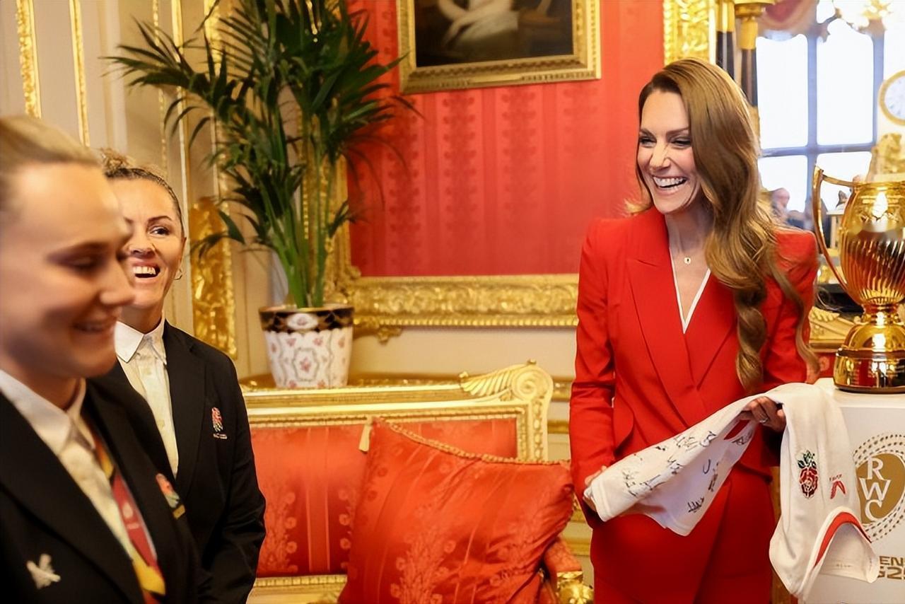 全新麦昆套装,新年新貌的凯特[惊喜] 温莎城堡里召开了为英格兰橄榄球队的庆功会, 作为皇家赞助人,凯特的欣喜漾在眼底, 这套全红难得低领,不规则下摆显别致, 恰好衬拖王妃的大长腿,只是,凯特好像又瘦了[笑哭]