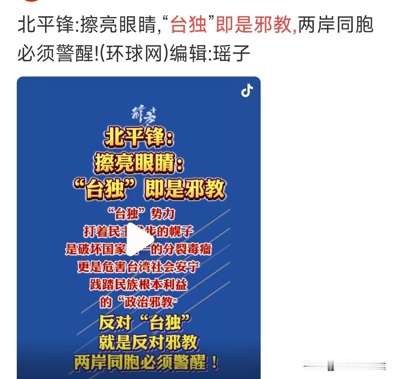“台独”就是“邪教”!这样的等同说法 台湾帅化民表述很恰当! 台湾时政评论员帅化民表示:民进党这些台独分子,根本听不懂人话,无论对台独分子及青鸟们如何喊话,他们就是听不懂。而一直迷恋迷信台独言论,把“台独”当成一个“邪教信仰”。 不过台独的言论确实让台湾的一些青年人跟风 ,就像被中了邪教魔一样的跟随, 同时台独分子也是被邪教给控制住了,明知道美国 出售给台湾是落后的武器,但台独分们还是要了,明知美国 66 架 F-16 战机不能及时交货,但台独分子们立即将钱全数交给美国。美国要求台当局投资 5000 亿美元 换取 15% 关税,台独民时党也二话不说将签下贸易协议,台独民进党这些人就像得了魔症一样的被美国控制了。 台独分子们明知到无法与解放军对搞,但台独分子就是要抗中保台,大陆明明已经是十分强大了,而台独分子们确实造谣中国大陆吃不起茶叶蛋 高铁座椅没靠背 洗手间没门等等,这种完全被台独意识形态所控制的台独分子们,就是一群邪教组织一样装聋作哑。 所以“台独理念”就成为这些台独分子及部分台湾青年们的精神支持,犹如被邪教所控制了精神意识一样。 台独就是邪教,邪教就是要被破除,邪教就是控制人的意识,到处招摇骗术,这更是形象比喻了台独民进常到处招摇拐骗台湾人民 为了骗取选票 什么事都干得出来,拿着台独邪教的理念毒害老百姓 毒害青年人 为了选票 更是不要脸 不要自尊的出卖祖宗 数典忘祖 认贼作父! 所以台独即是邪教 毒害不浅呀!