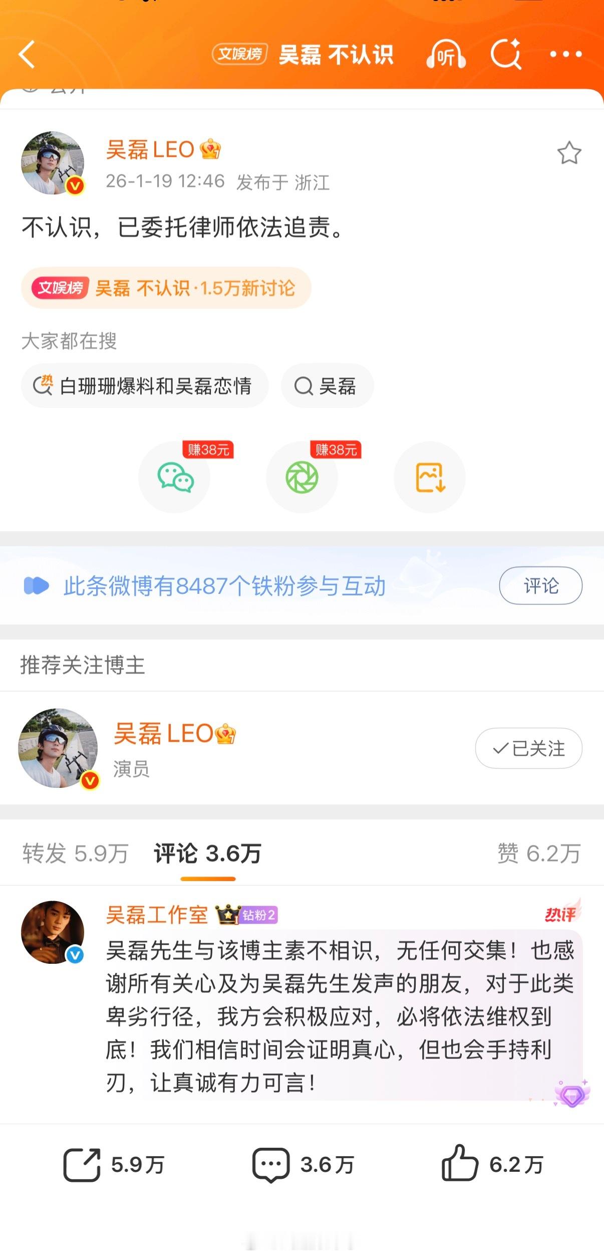 吴磊 不认识吴磊明确回应不认识白珊珊,并且已经提起诉讼。感觉这个人就是个骗子,相信吴磊,支持他依法维权必须告到底!