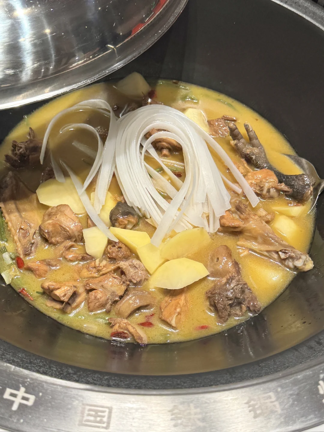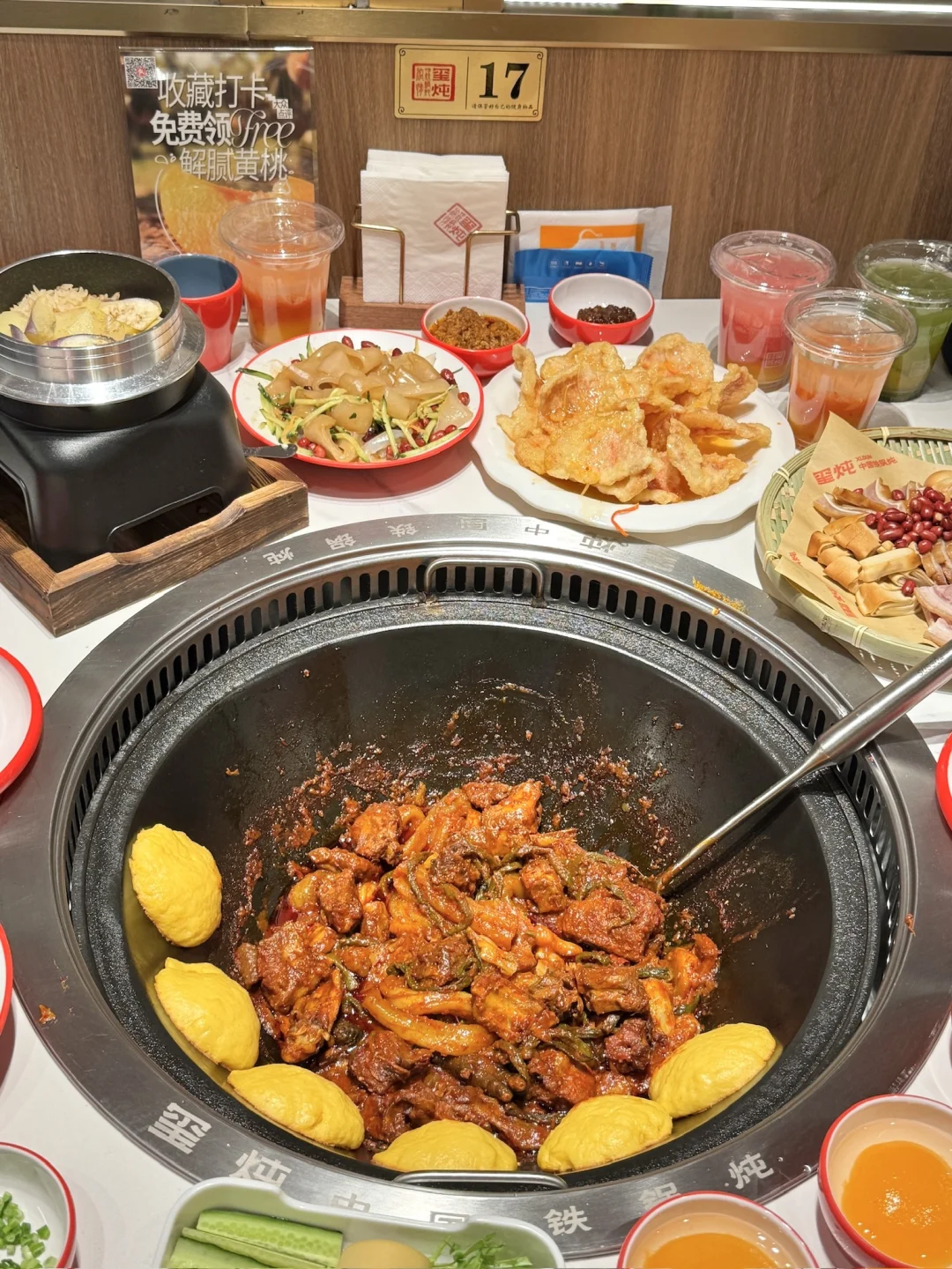 一整锅热气腾腾的♨️冬天直接暖到心头! 辣糊糊铁锅炖必点,肉肉炖得软烂挂汁,配菜裹满辣糊糊巨入味,越煮越香好下饭!羽衣甘蓝雪桃饮、红果果冰雪桃饮酸甜清爽,辣口配甜口好快乐!!