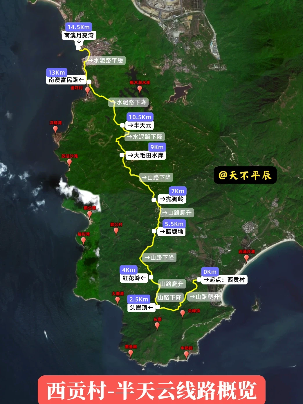 西贡村-半天云徒步路线,位于深圳市大鹏半岛西南部,是一条连接西涌西贡村到半天云的山脊穿越路线,也是一条人少景好的小众徒步路线。全程约11公里(因半天云没有公交,我走到南澳月亮湾,共计14.42公里),最高山峰抛狗岭,海拔422米,全程需要5~7小时,路线相对简单。