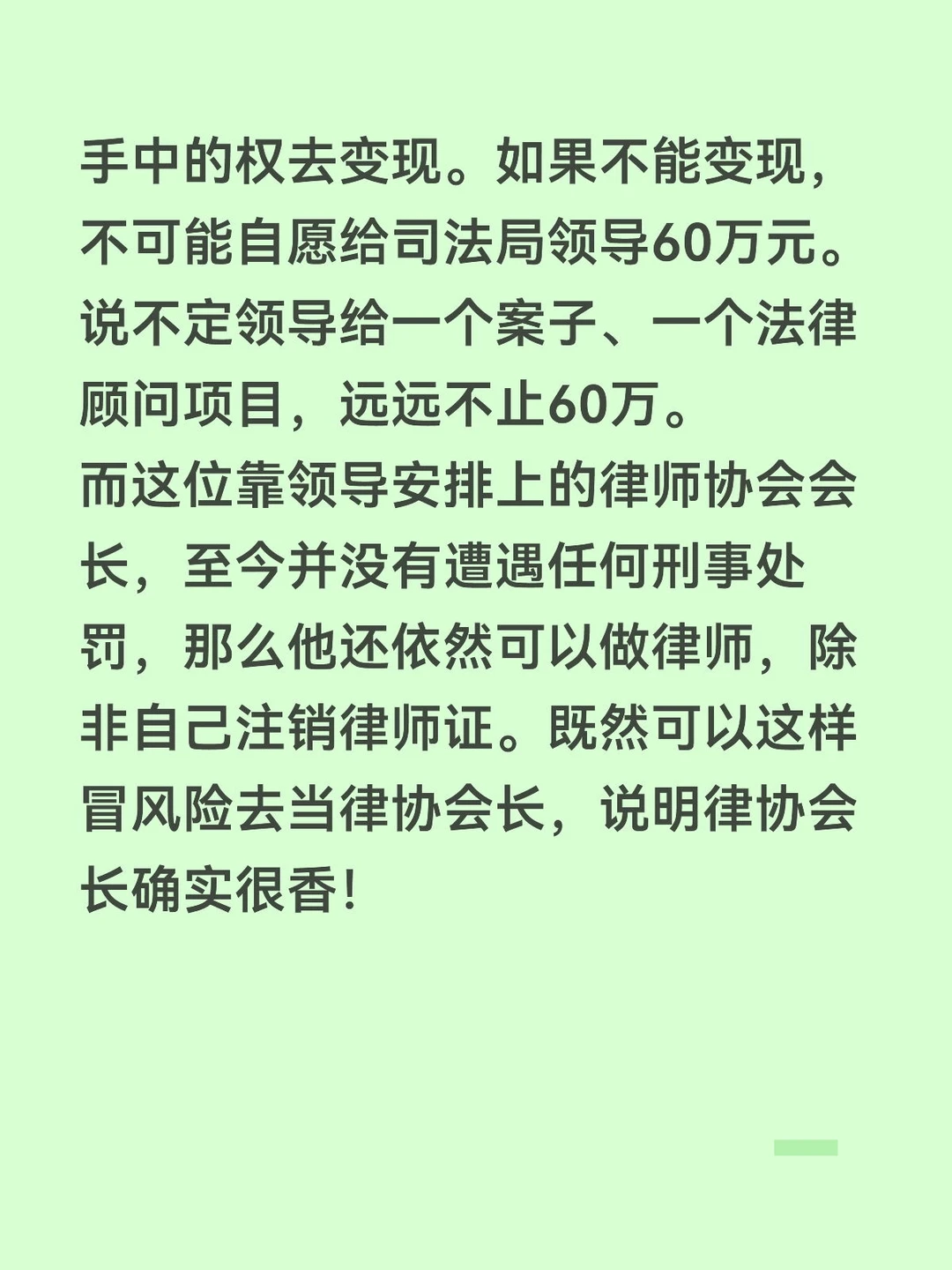 这件事情让我们想到,不仅仅是律师行业,包括其他很多行业,每个行业的人都想做“官”,只要当上能够管别人的职务,那就有机会利用手中的权去变现。如果不能变现,不可能自愿给司法局领导60万元。说不定领导给一个案子、一个法律顾问项目,远远不止60万。