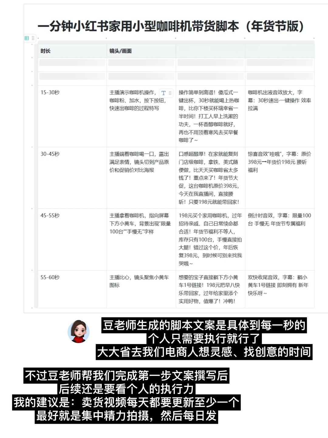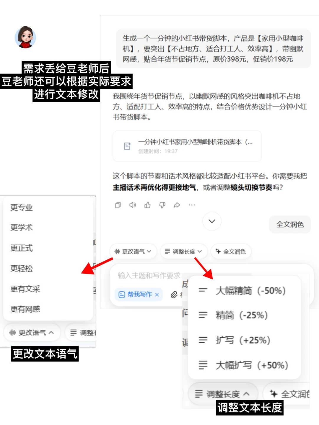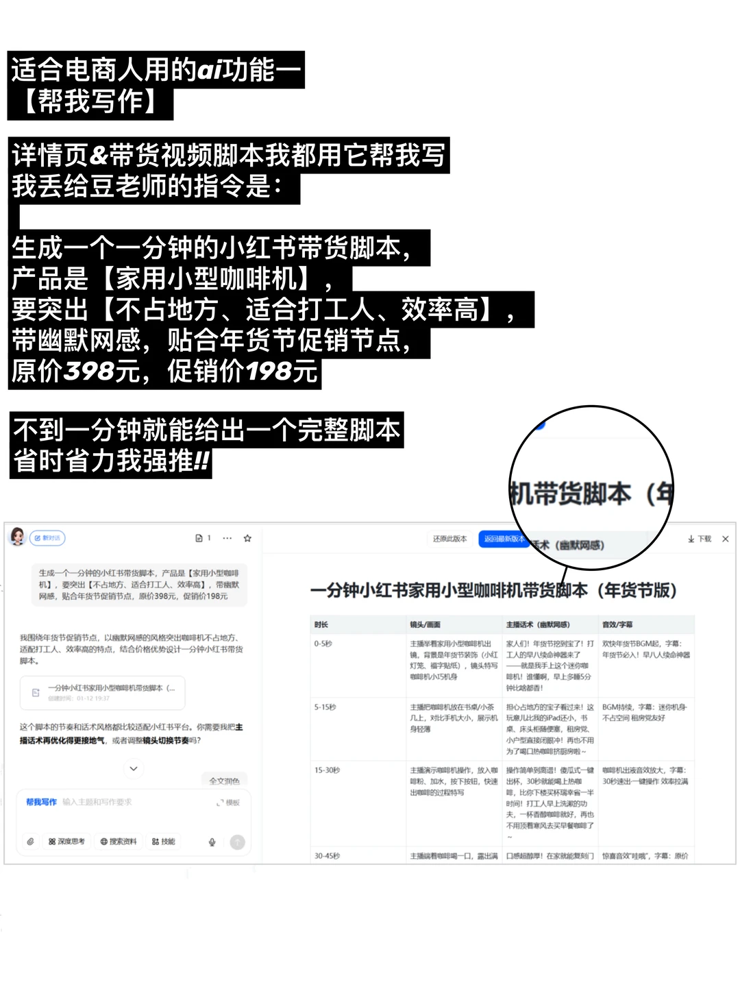 ✅帮我写作——产品卖点可以直接用豆bao梳理成专业的详情页文案,另外想拍带货视频又不知道该怎么拍的时候,可以直接用ai先把脚本写好,再根据脚本进行拍摄即可,省时又省力