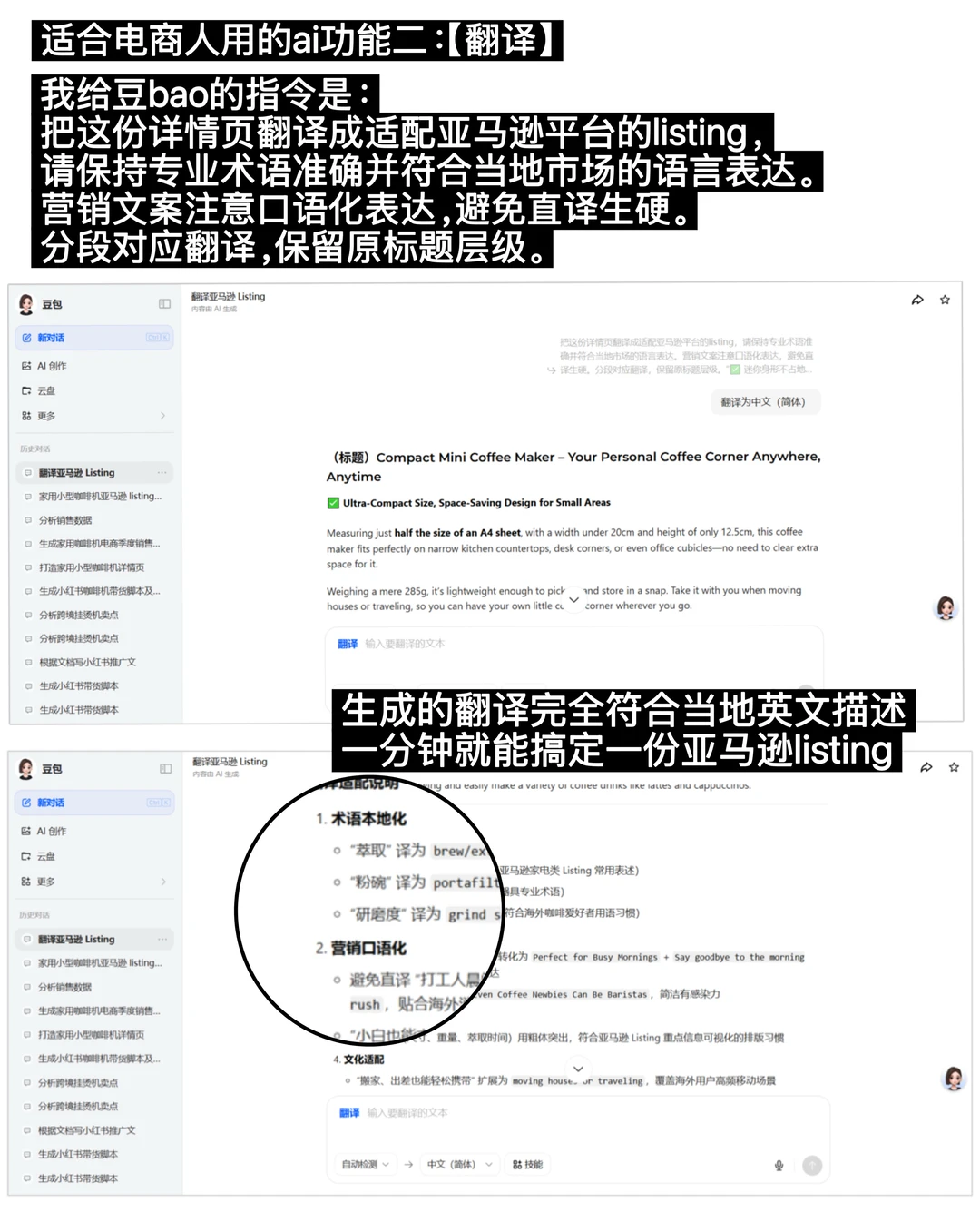 ✅翻译——做跨境电商但却不会英文,就可以直接用豆老师将中文的详情页描述翻译成符合当地人购物习惯的英文描述,一分钟就能搞定一份亚马逊listing