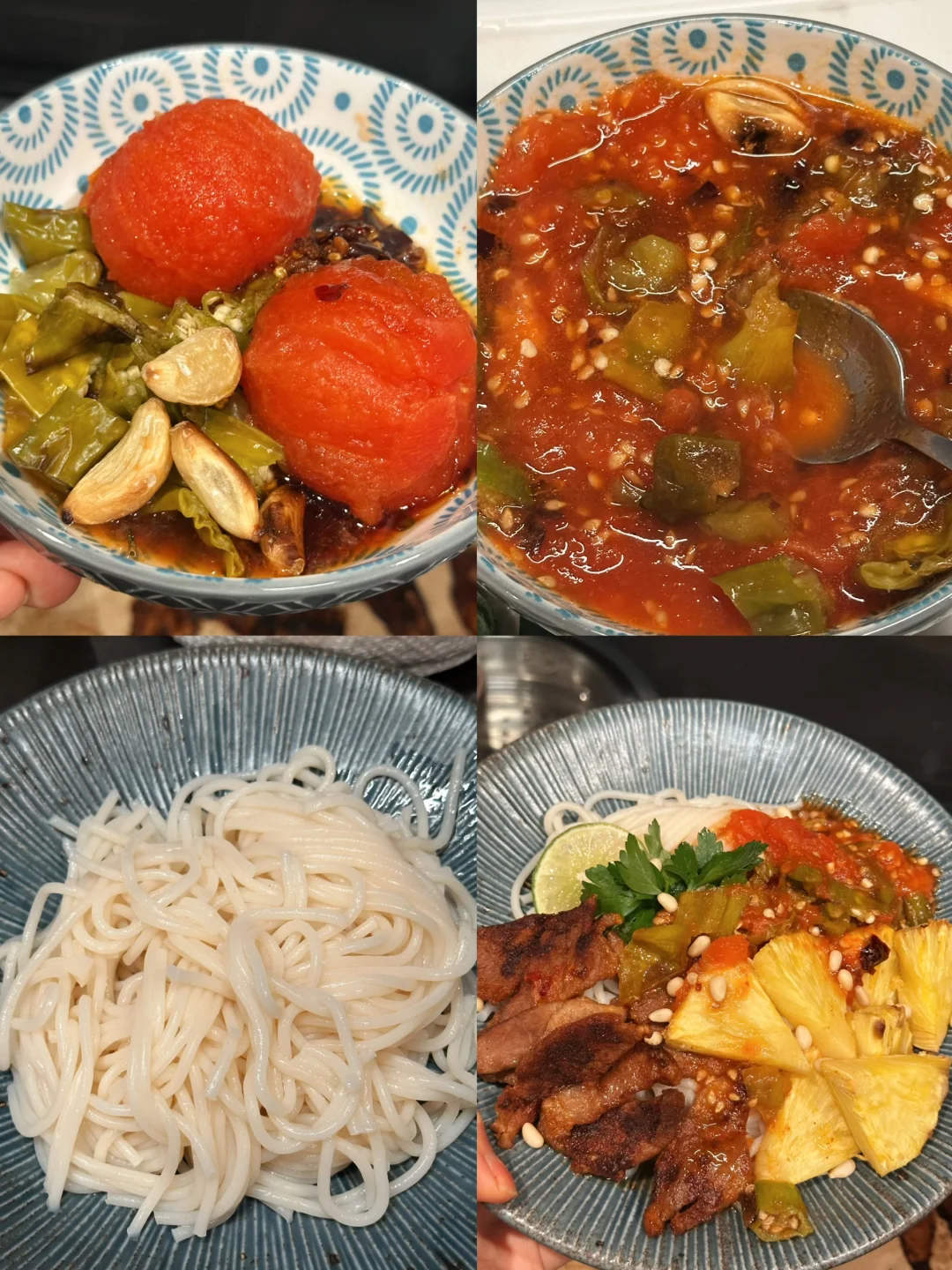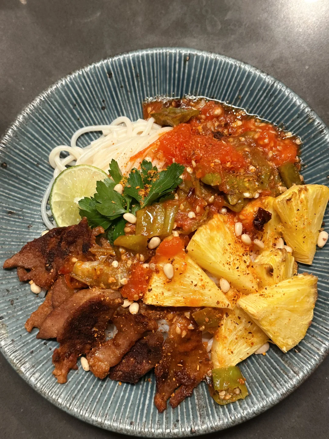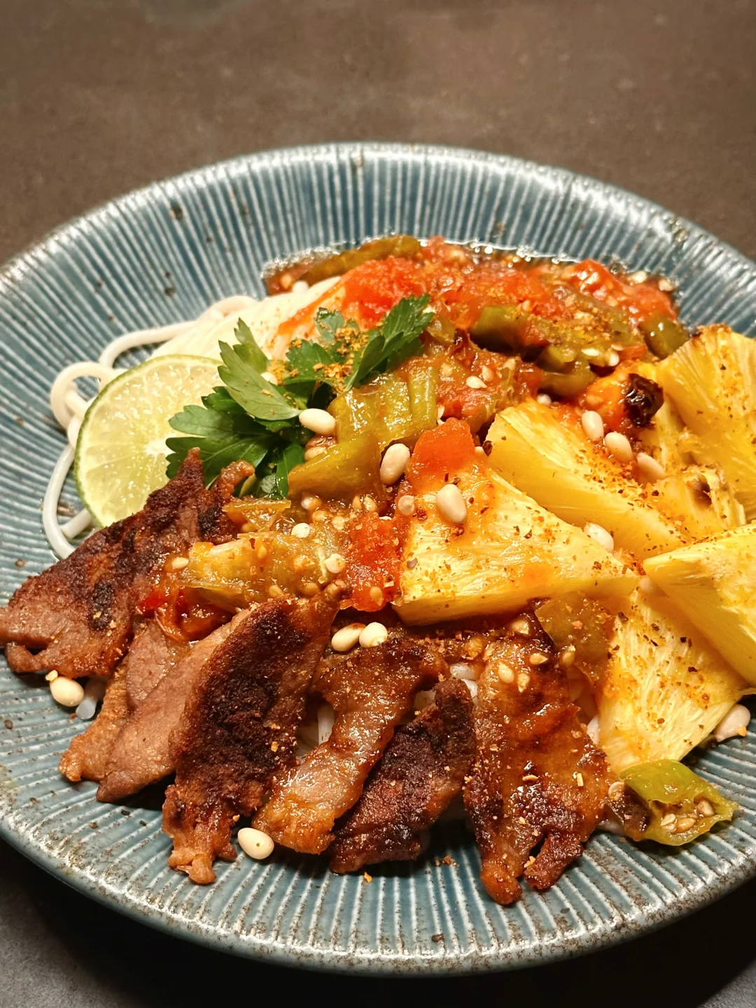酸酸辣辣的番茄卤伴着滑溜溜的米线格外开胃,烤猪肉喷香多汁,烤过的菠萝特别甜,每一口的排列组合都是美味!