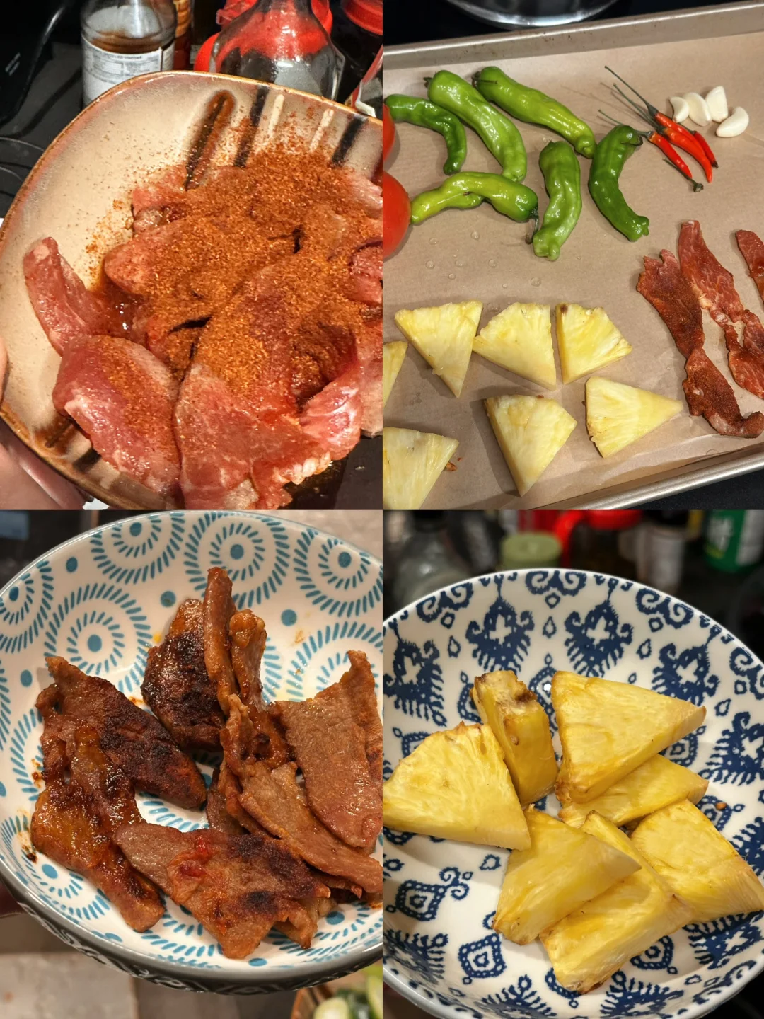 猪肉,蒜粒烤15分钟就好了,可以先拿出来,番茄辣椒和菠萝可以再烤10分钟;