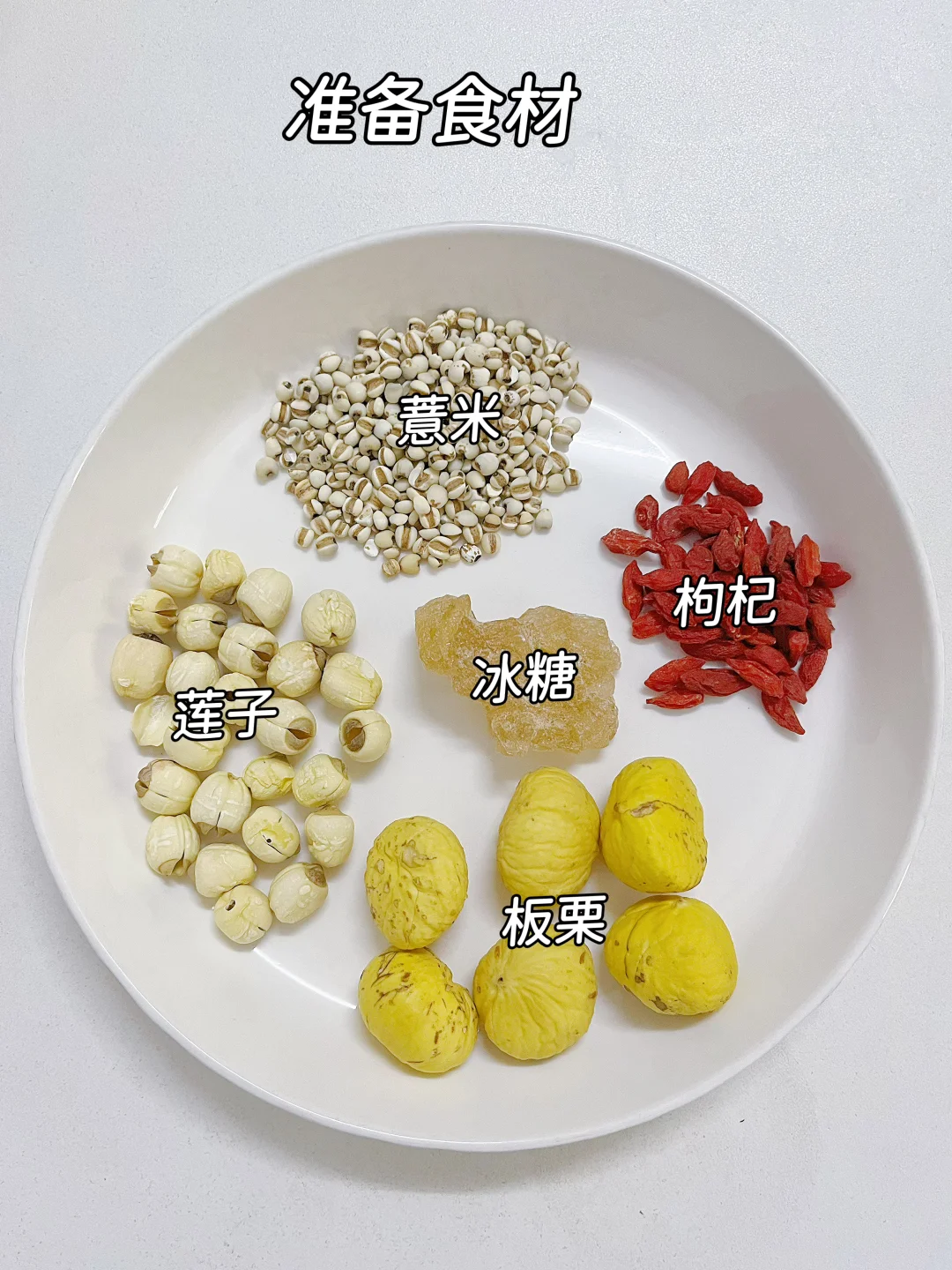 薏米2把+莲子1把+板栗6颗+冰糖1块+枸杞1小把